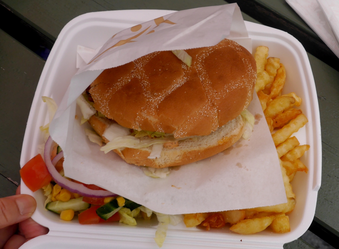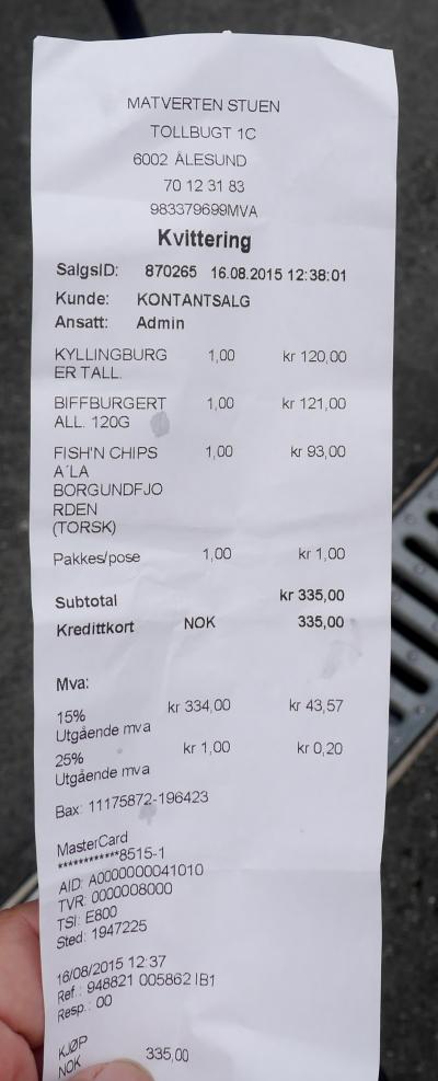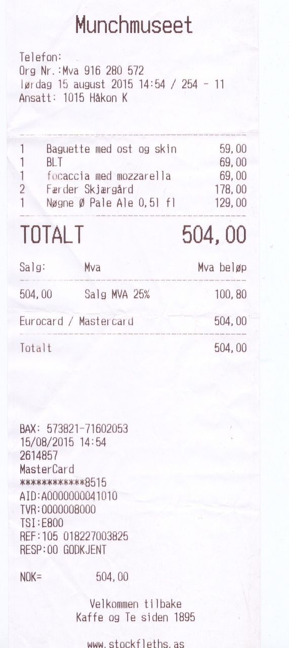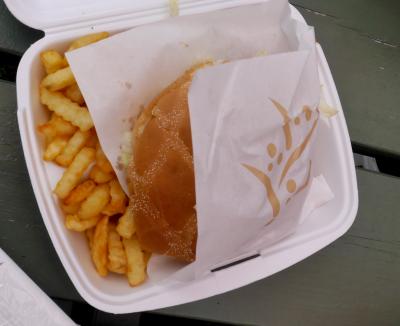 タクシーの運転手さんが教えてくれたMatvarten Stuenというスタンドだ.人気があるようで中に座る席もあるがいっぱいだった.ビーフバーガー121NOK.チキンバーガー120NOK フィッシュ&チップス ポテト付き 93NOK 袋1NOK 〆て335NOK 5000円近いね.このときは皆水は自分で持っていたのでそれで口を潤す.ボリュームがあるので女性なら2人で1つで十分 フィッシュ&チップスはまあまあ.簡単に食事をしたいときにはいいかな.でもノルウエーは物価が高い!