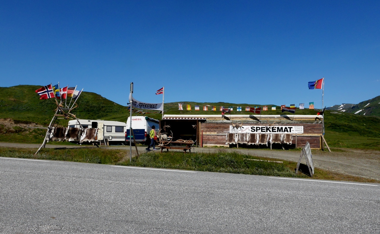 ノルウエーフィヨルドドライブ1700? 42-ロバが通せんぼ,Gudvangen,同じ道を帰る,サーメ人のおみやげ屋