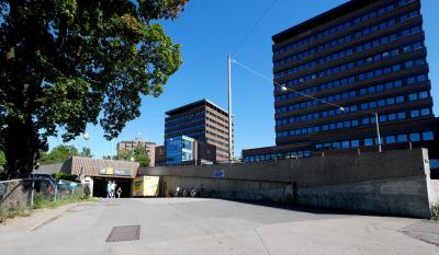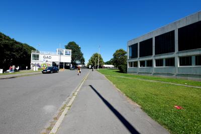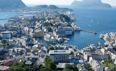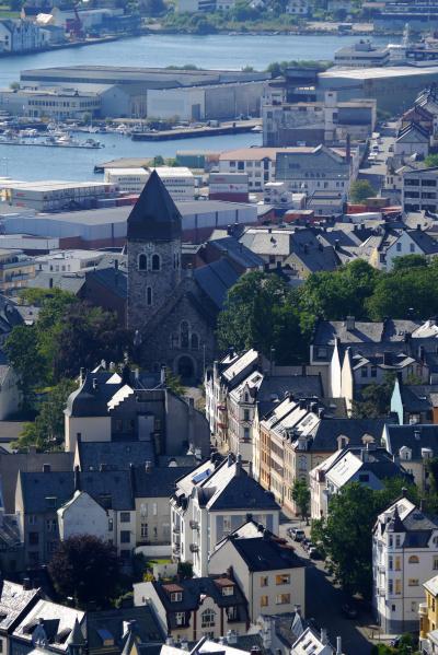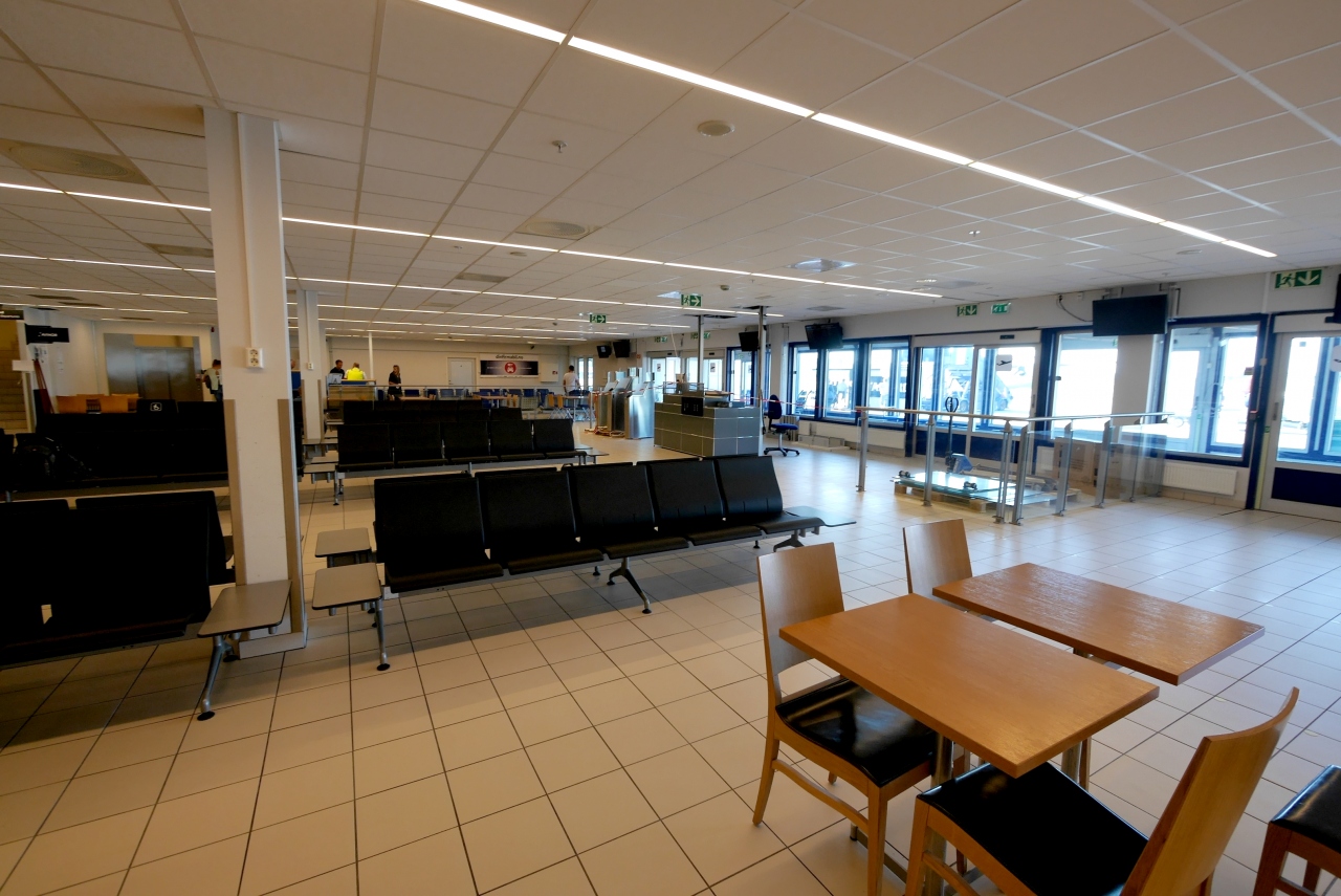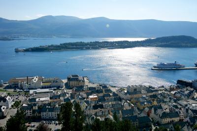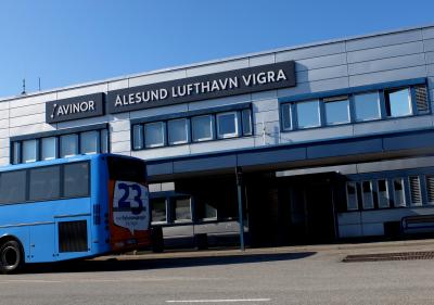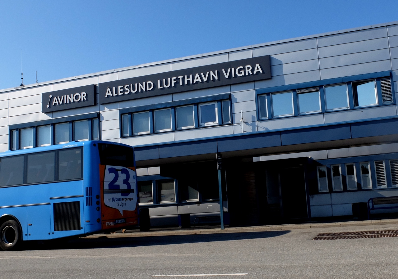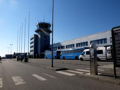 オーレスンの街からは約17? Vigra島にある.海底トンネルを2つ抜ける.30分程度.レンタカーの駐車場は空港のわき200mほどのところ.便利.タクシーも何台か到着時には待っている.出発の際はセキュリティーの後に,カフェ,売店などがあり便利な空港だ