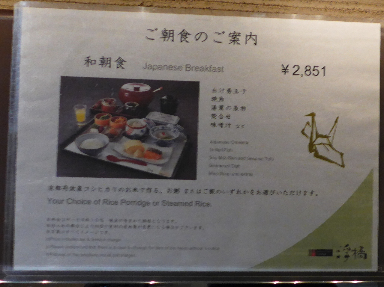 部屋は22000円程度が本来妥当な最高料金と思う.朝食は和定食 和定食にする.五つ星の水準の「京のおばんざい」の雰囲気を残した朝食だった.しかし朝食料金は割高と思う.熟年の夫婦が宿泊していたがとても高くてプライベートには泊まれない.- 旅行時期