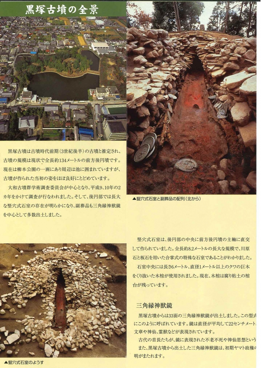 箸墓古墳と同じ最初期の古墳.箸墓の1/2で作られている 西暦260年すぎの造営だとのこと.全長134m 平成9,10年の調査で竪穴式の石室があきらかになる.地震による崩落があったため盗掘されなかった.33面の銅鏡が発掘されたのもすごい.誰の墓だったのだろう.ヤマト初期王権か,卑弥呼・箸墓と関連があるか.想像は尽きない.天皇陵でないので中に入れるのもうれしい.以前来た時に休みだった資料館もなかなかすばらしい.駐車場は市営の無料駐車場がファミマ天理柳本店駐車場に続いてある.