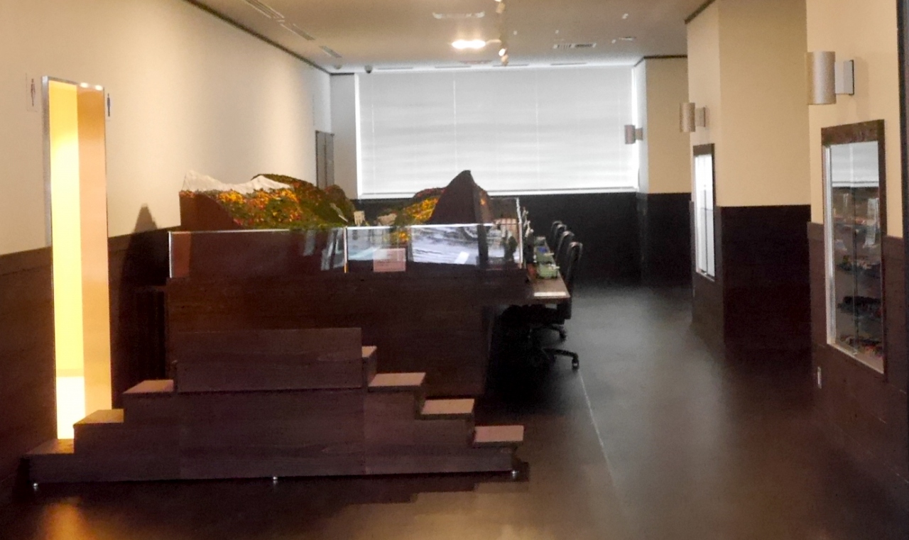 観光案内所と共にキハ52待合室というのがある.首都圏色といわれる朱色一色でなく国鉄一般気動車色に新たに美しく塗装された車両.部屋が小さすぎて,前後から眺められないのが惜しい.しかし往年の大糸線を思い出す.中央本線から(もちろん塗装も異なる急行気動車色だったが)の直通の急行アルプスなど思い出す.実はここの目玉はジオラマ鉄道模型ステーション.残念ながら10時に開館なので見ることができなかった.残念!