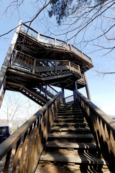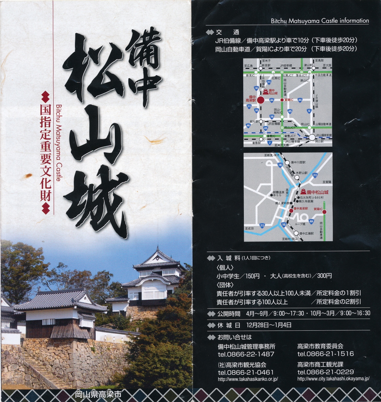 シーズンオフはふいご峠駐車場に駐車できる.12台のスペース.シーズンや休日はふもとの城見橋公園駐車場からシャトルバス.臥牛山,小松山430mにある備中松山城天守閣にには700m徒歩20分.やはり古い城はすばらしい.六の平櫓の視聴覚室で歴史は小堀遠州,赤穂義士とのかかわりなど3本の短編解説ビデオを見ることができる.天守は二層になっていて,一階には囲炉裏,装束の間,二階には御社檀が残っている.装束の間は一段高く,城主の家族が籠城の際にいる場所,そして落城の際に自決する場所だ.御社檀には守護する神々をまつる.本当に戦国時代を見るような作りだ.裏側の二重櫓,そして後曲輪まで行ってみた.東御門,腕木御門,五の平櫓,六の平櫓は復元だが,良くマッチしている.しかし良くこんな岩の上に建設したものだ.高梁城下からは徒歩で一時間かかる.そのため普段はふもとの御根小屋に住んでいたようだ.1683年に水野勝宗が修築したとのことだが,1574年ごろの備中兵乱(備中の戦国大名三村元親と毛利氏・宇喜多氏による戦い)の際にはこの山全域が一大要塞となっていたようだ.