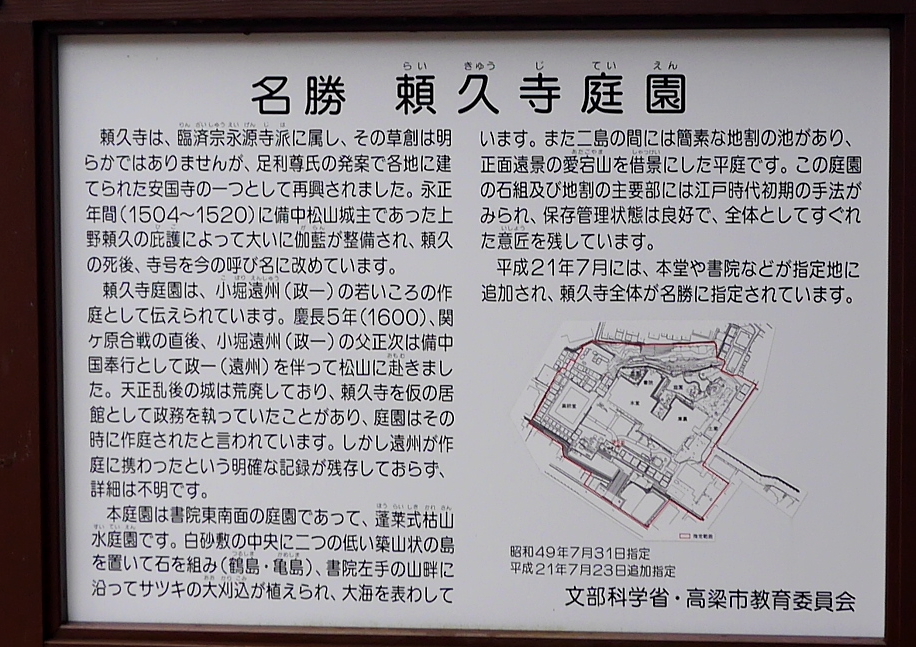 1600年(慶長5年)、関ヶ原の戦いで東軍についた功により小堀正次が備中国1万4千石に封じられ、1604年(慶長9年)に逝去したため子の政一(小堀遠州)が遺領を継いだ。この頃の備中松山城は備中兵乱後で荒廃していたため、政一は頼久寺を仮の居館とし、1619年(元和5年)の移封までここで過ごした。