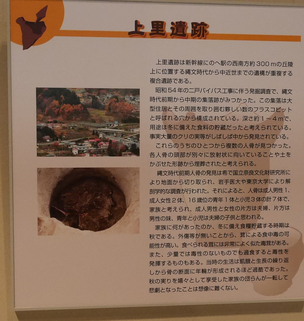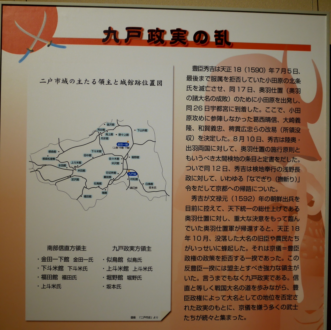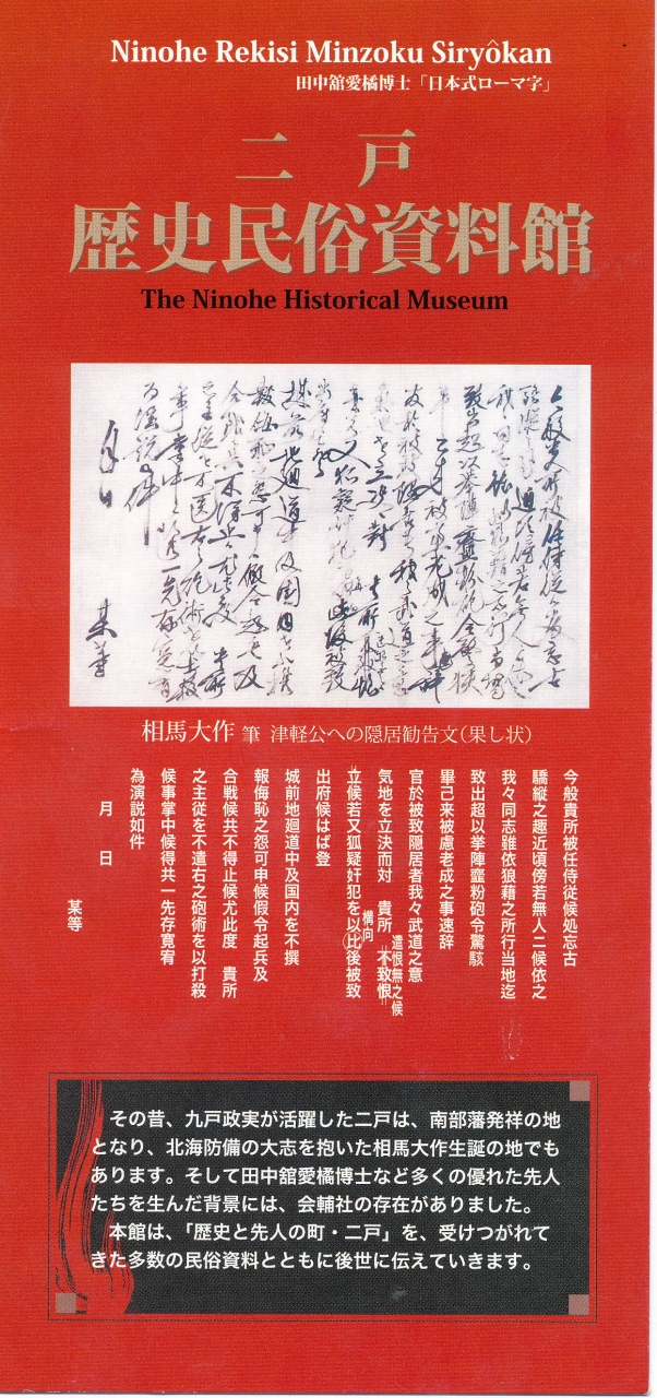 ここは考古学資料よりも九戸政実の事跡の紹介が詳しい.わたしは埼玉行田の忍城の籠城のことは知っていたが,それよりもなお後で,それも秀吉の朝鮮侵攻のあとにたてついた武将がいたとは..南部氏と九戸氏の確執から,籠城,奸計をもって和議をし,結局惨殺処刑されてしまう.その歴史がビデオとともに良くわかる.その他上里遺跡などの展示があるがメインは九戸政実だ.その点歴史を知るには九戸城跡に行く前に知識を得る価値がある