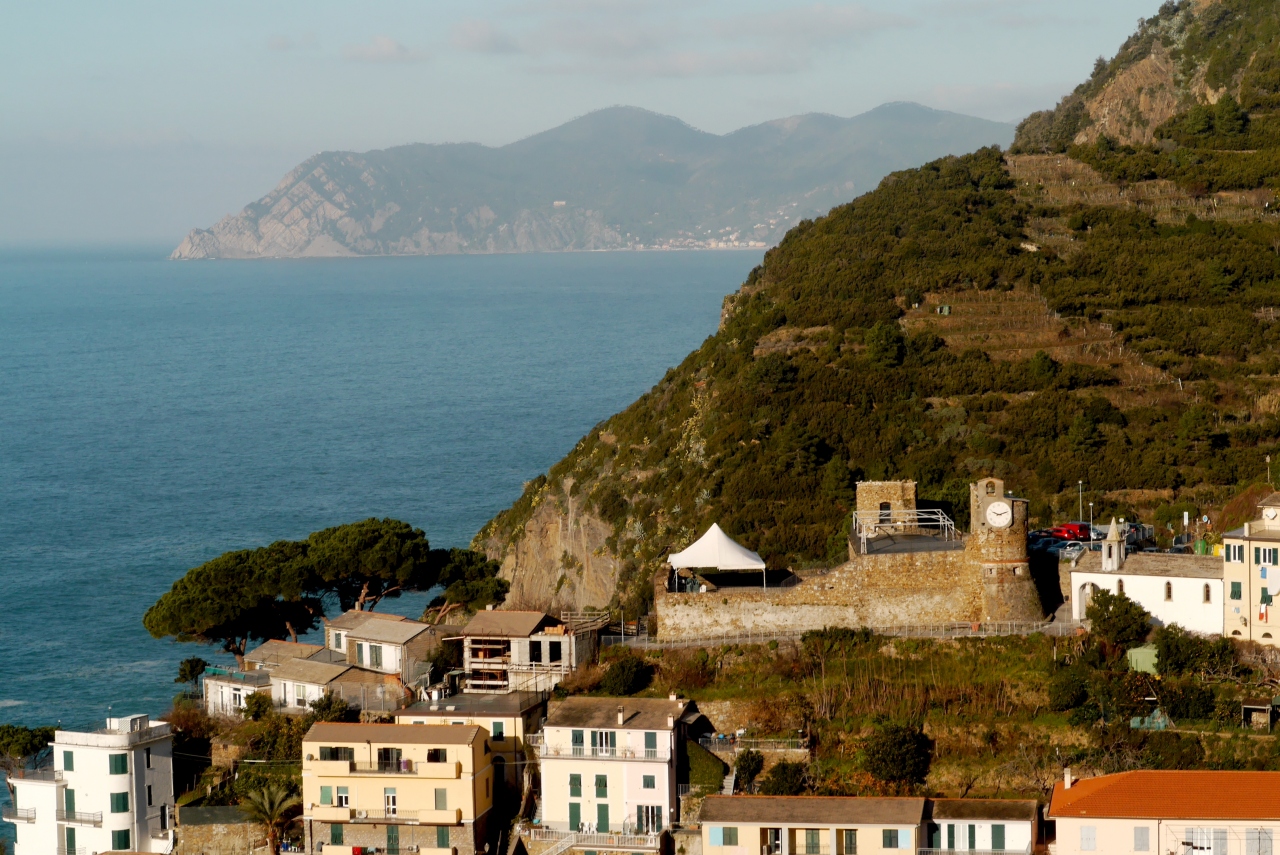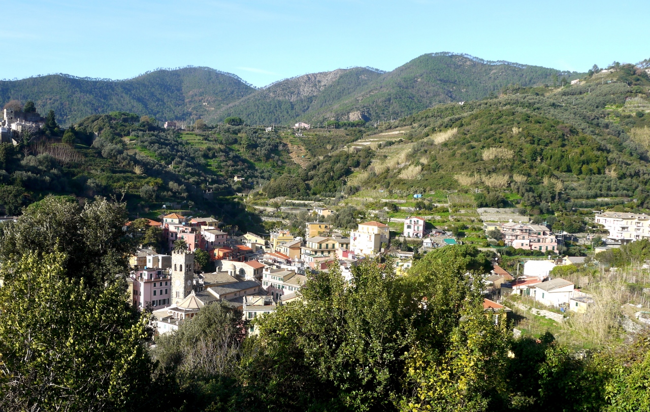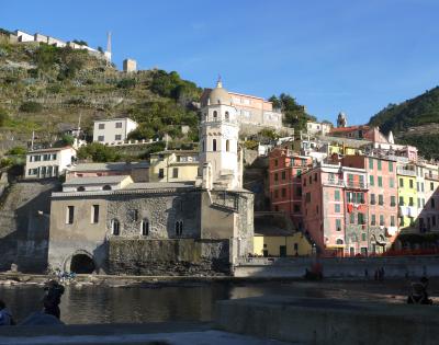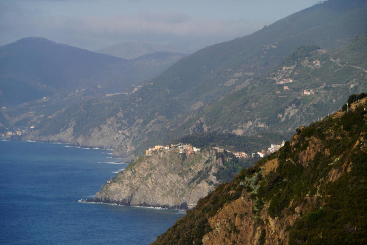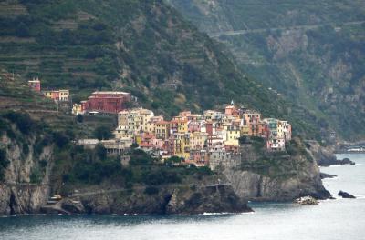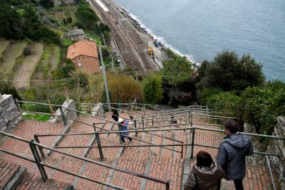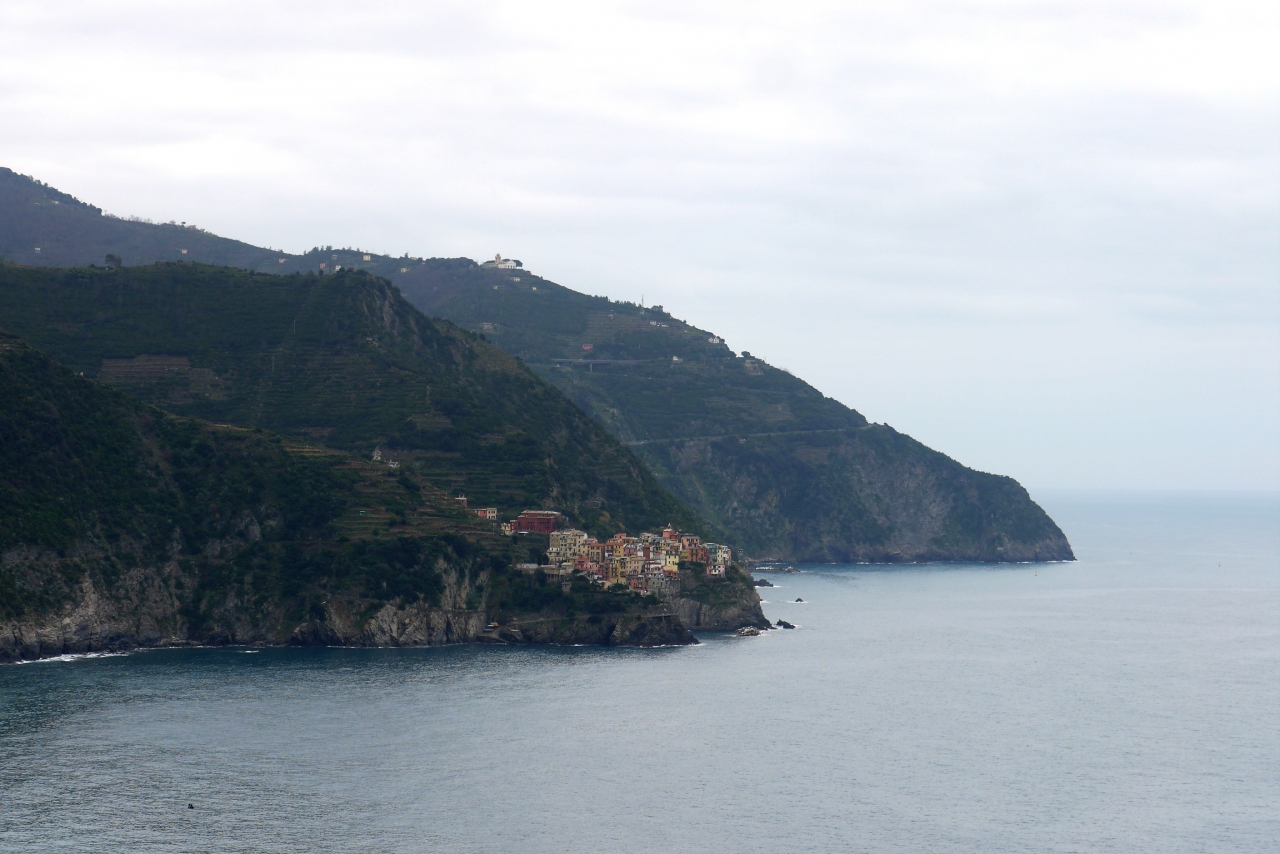 Cornigliaの駅から,バスがあるが本数が少ない.歩くと365段の階段を上がることになる.なかなかの路だ.町は丘の上.チンクエテッレでは唯一海に面していないが,別の階段を下りていくと港がある.2つの教会(聖ピエトロ教会,聖カテリーナ教会)がある.景色がよく(サンタマリア展望台,要塞の跡),残念ながら曇って居た日だが,Monterosso,Vernazzaの一部,Manarolaがよく見える.チンクエテッレの街のうち一番行きにくい街だが,よい街だ.