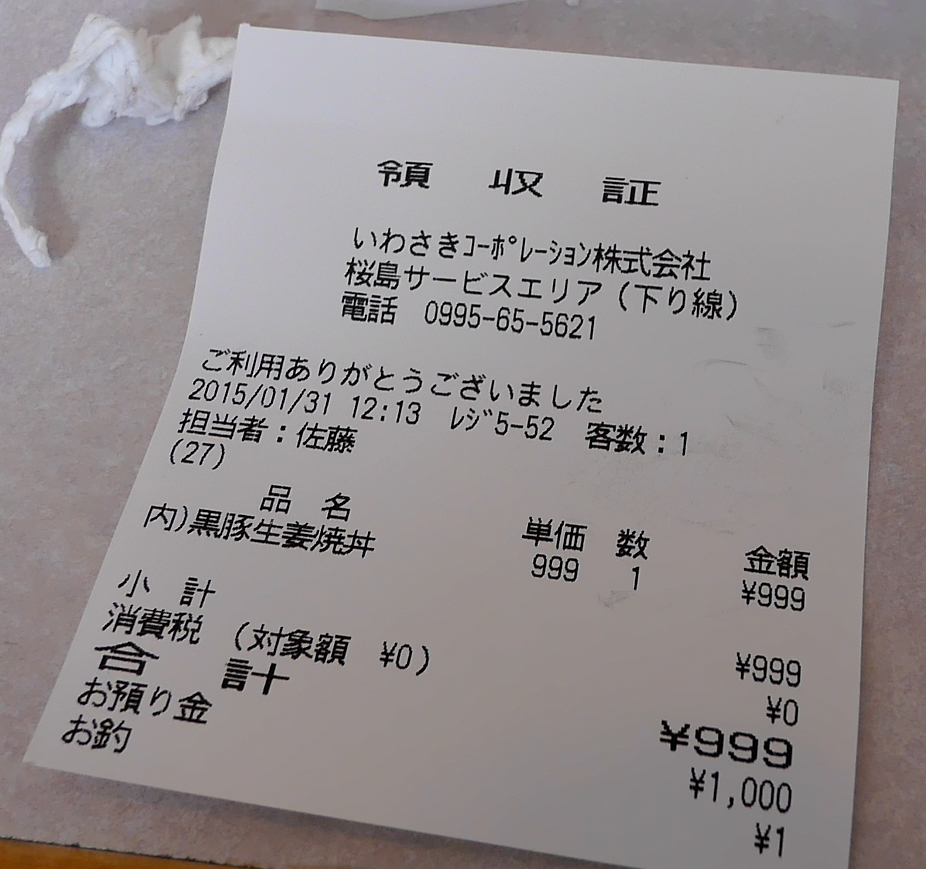 税込999円の黒豚生姜焼丼,みそ汁とお新香付き.税込なので安いし,それなりにボリュームがあっておいしかった.値段を考えると食べていいレストランだ.その他の種類も割とあるようだった.桜島にも近く景色もまあまあ