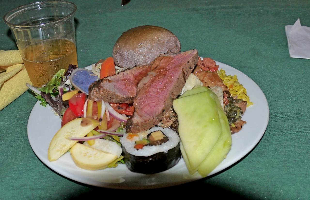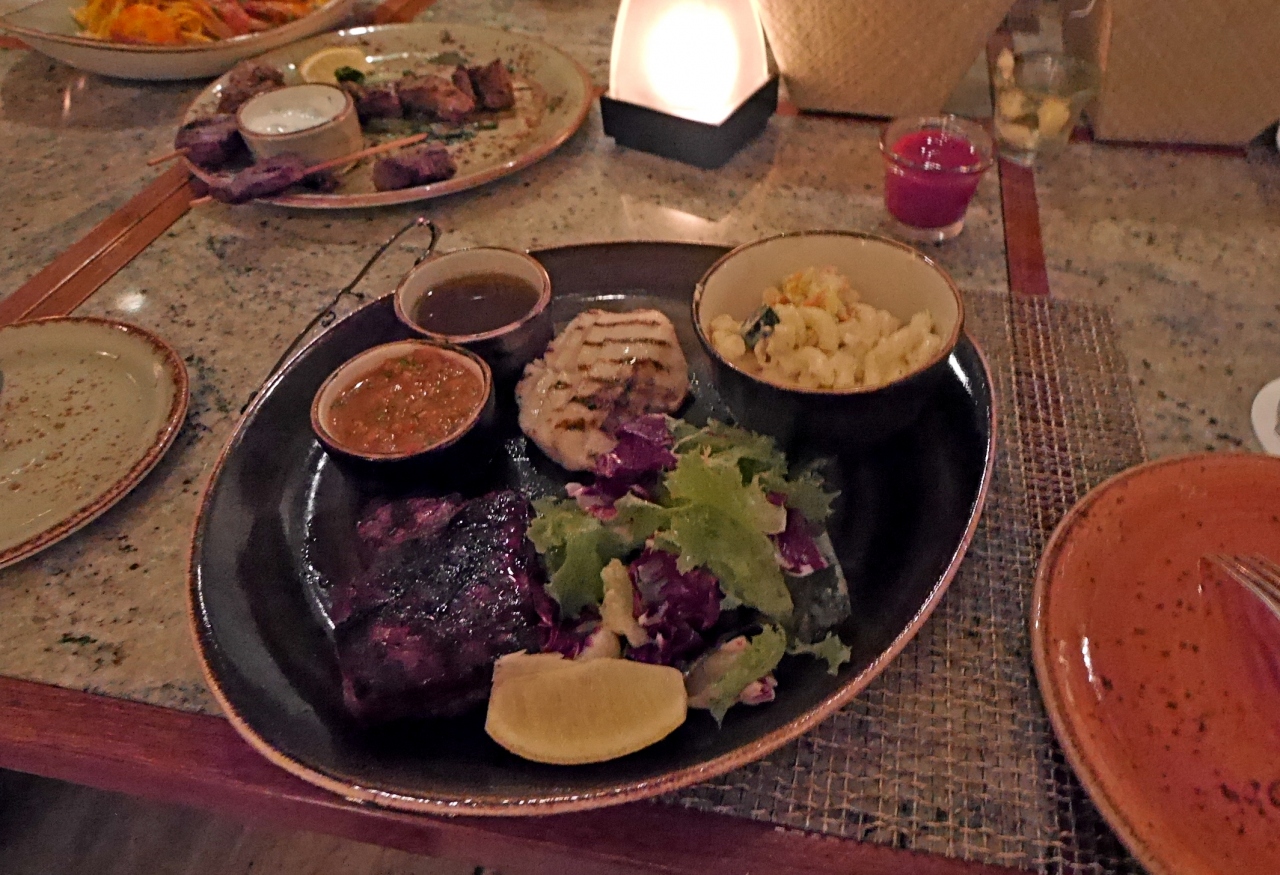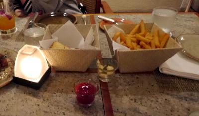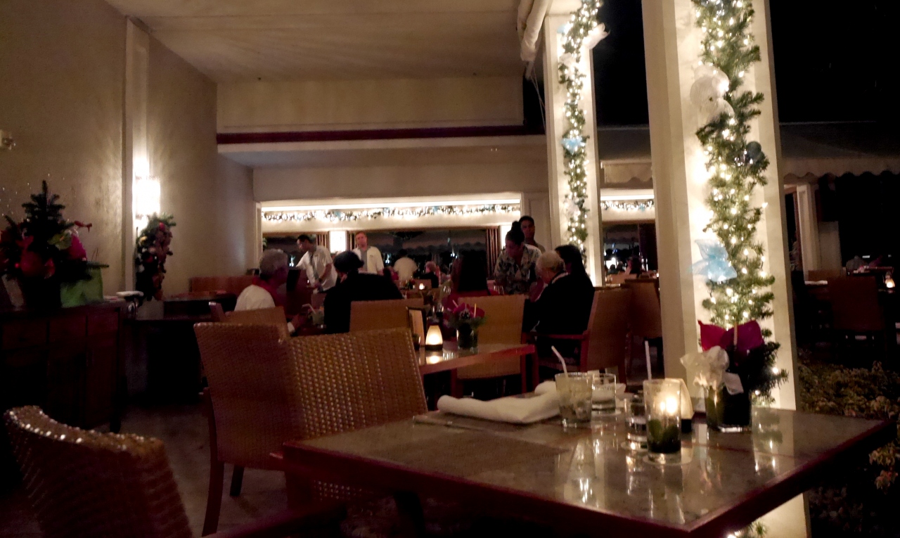 ホテルハレクラニのHouse without a key 土日はSurf and Turf Barbechueになる.バーベキューはわりと素材を生かしていておいしかった.ビールとワインで大満足.その割には89ドルとそれほど高くなかった.雰囲気はハワイらしくていい感じのレストランだった.若いカップルだと素敵だろうね.バーベキュー.肉と魚を一品づつ.私はサーロインステーキとハワイ産スズキ(Hapu'upu'u)にする.ソースは醤油レモンとトマトサルサにした.