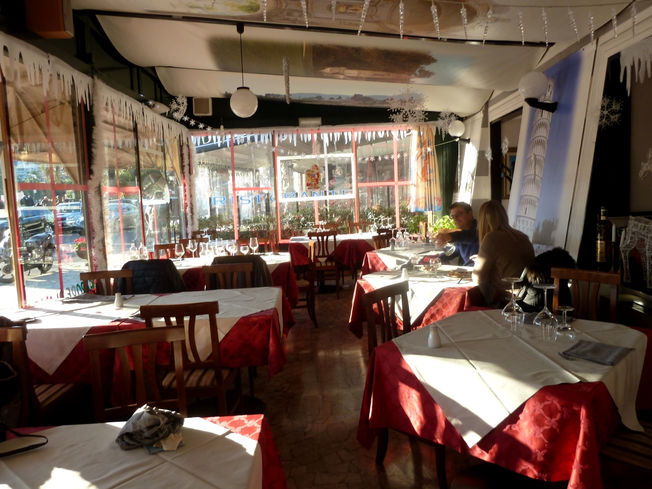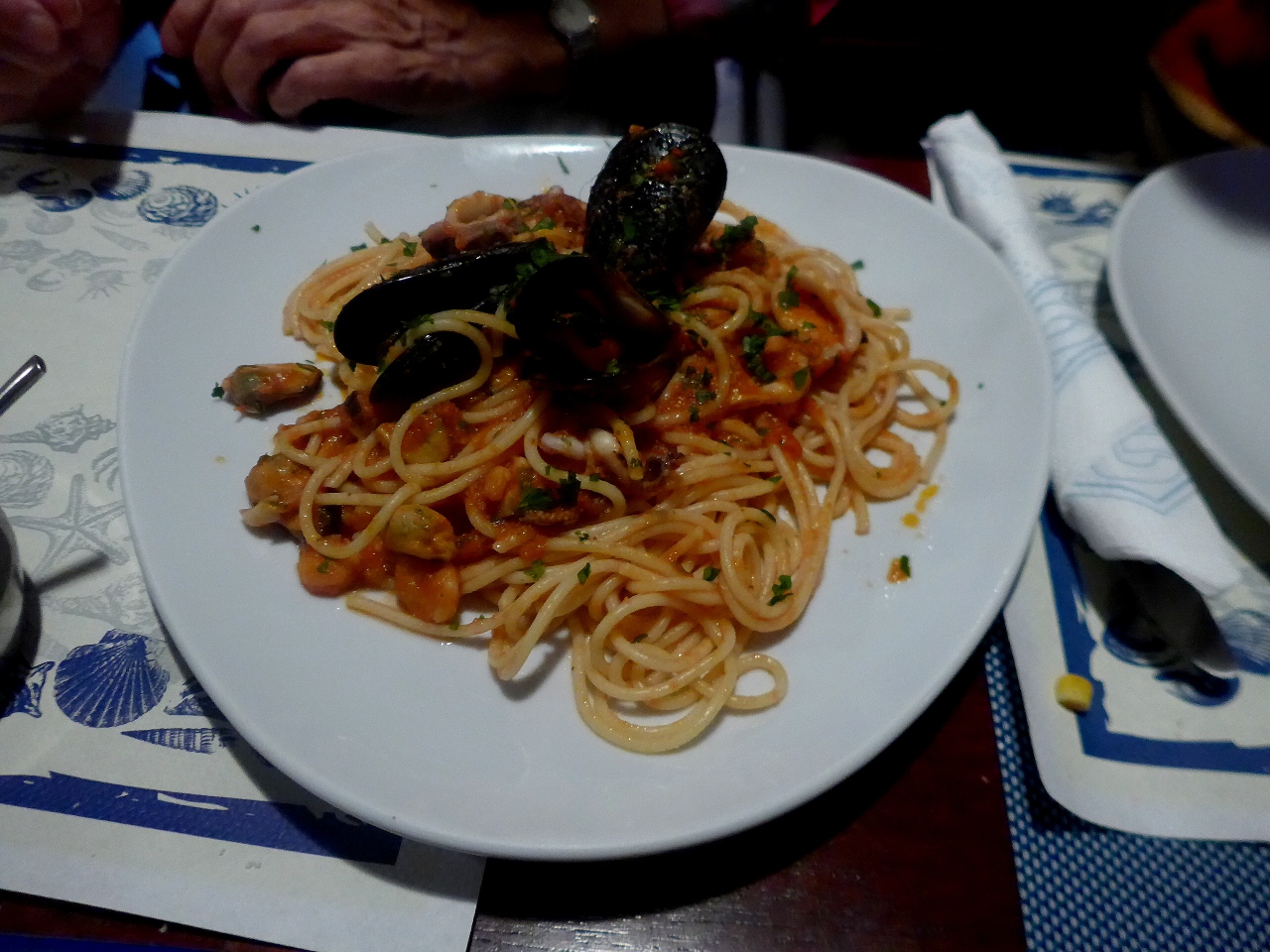 Rapalloの海岸べりにあるレストラン.焼いた魚介プレートがとてもおいしかった.素材の味を生かしレモンと塩だけで食べる.しょうゆがあったらいいね.22ユーロ,ペスカトーレ12ユーロ.ムール貝の煮込み9ユーロと手ごろ.ビール4.5ユーロ,コーヒー1.5ユーロ,チンクエテッレの白ワイン22ユーロ.雰囲気も開放的で,リヴィエラに来た雰囲気.入っていいレストラン