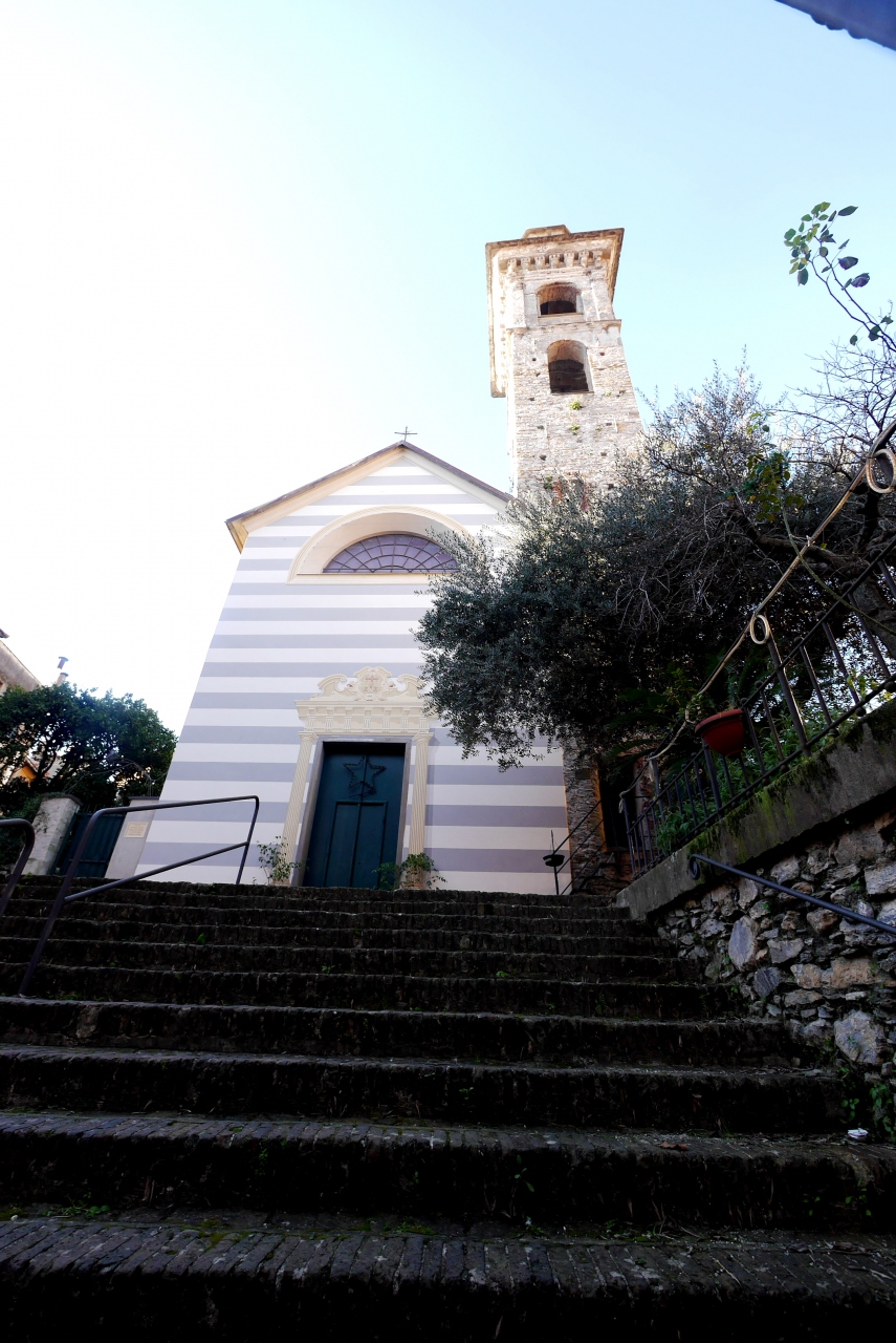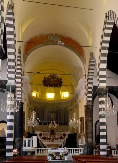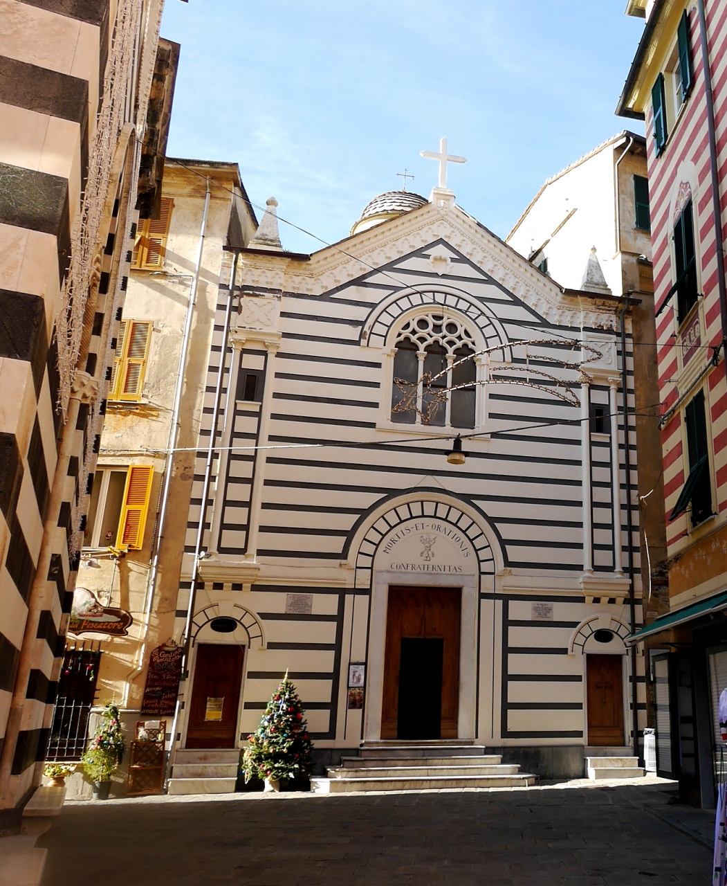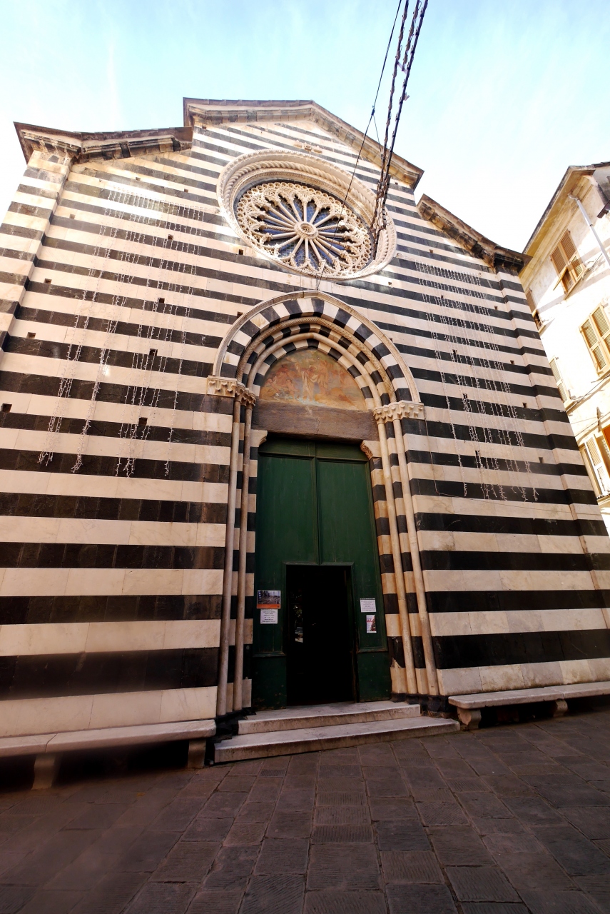 Monterossoの13世紀から続く古い教会.古い鐘楼も印象的だしゼブラ模様もなかなかと思う.隣の死と祈りの礼拝堂にはたくさんの亡くなった人の写真が飾られている.この村の古い写真が多いので町の歴史もわかる.きれいな街に古い教会.とても印象的だ