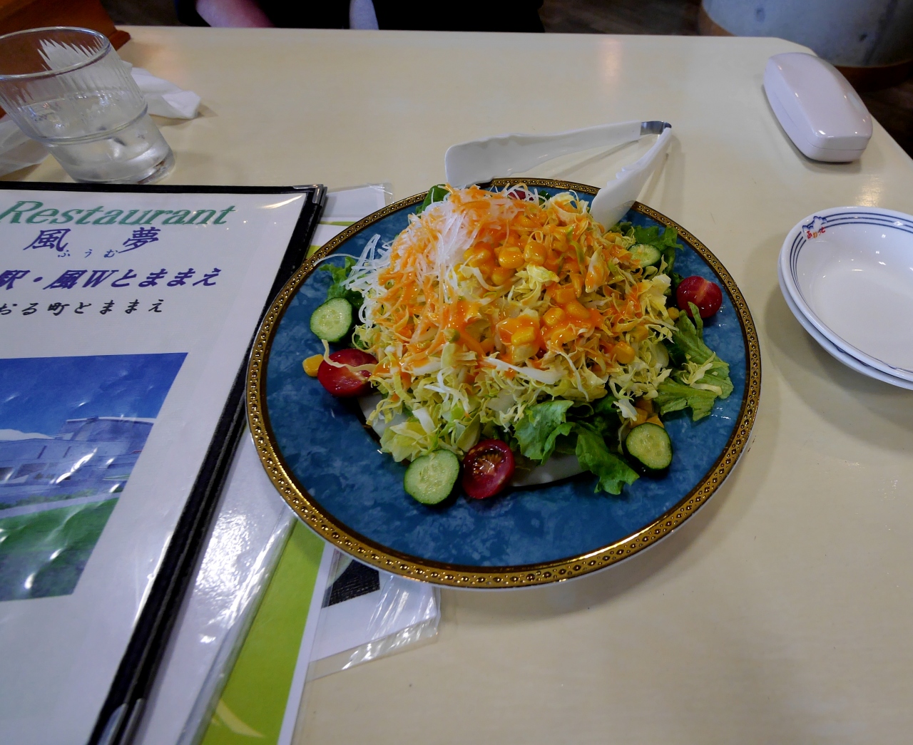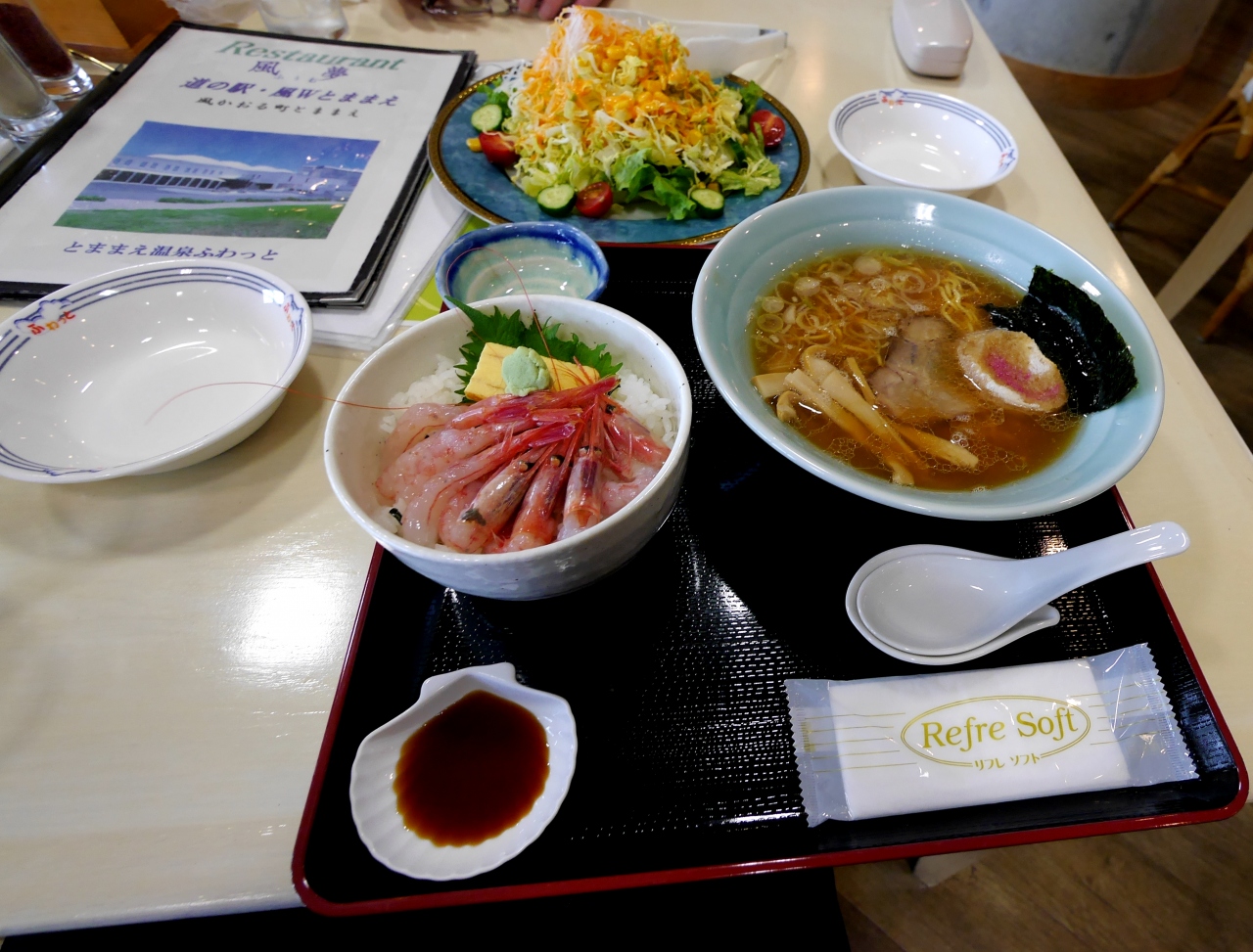 道の駅,ふわっととままいの中にある.オロロンラインの真ん中なので昼食にしやすい位置にあると思う.ふわっとセットというどんぶりとそば類のセットで,甘エビ丼とラーメンセットとした.甘エビ丼がおいしかった.家人は普通の中華丼だったがボリュームたっぷり.野菜サラダもボリュームたっぷり.おなかが減った人向きのレストランだ.おすすめ.