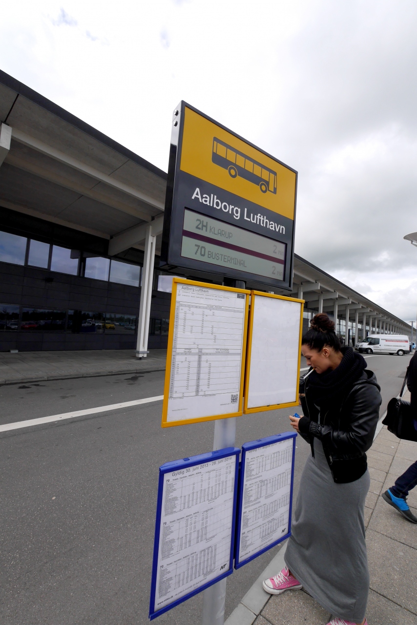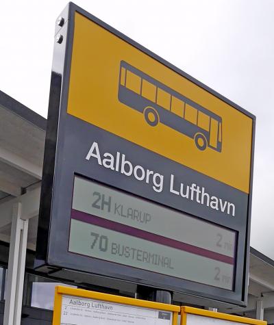 コペンハーゲンからICでは5時間近くかかるAalborgはCPH空港からはわずか飛行機45分と近い.航空運賃も比較的安く,飛行機で行ったが,空港からの接続が若干心配だった.しかしたくさんの路線バス,市内の北西側からのバスが空港による.2番(2A,2Bなど),22番など比較的良く来る.Lindholm経由で,Limfijorden橋を越えて,市内まで20分,駅まで30分弱.とても便利.Radisson Blu Limfjord Hotel Aalborgなど市内のホテルにはNytorv (Østeraagade / Aalborg)が便利なので利用するとよい.物価の高いデンマークで20DKK!(400円弱!)日本でもこの距離乗れば,普通300円以上すると思う.