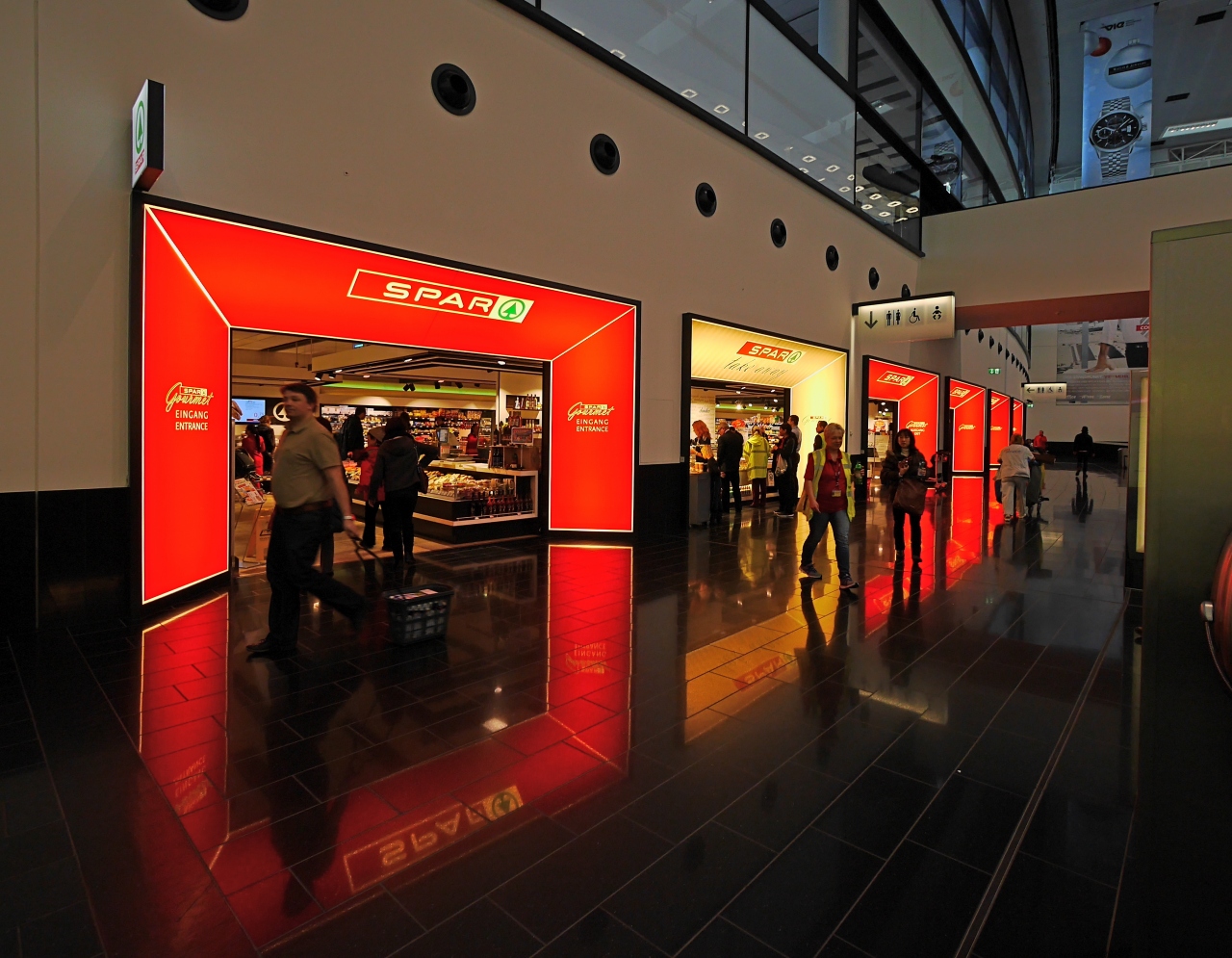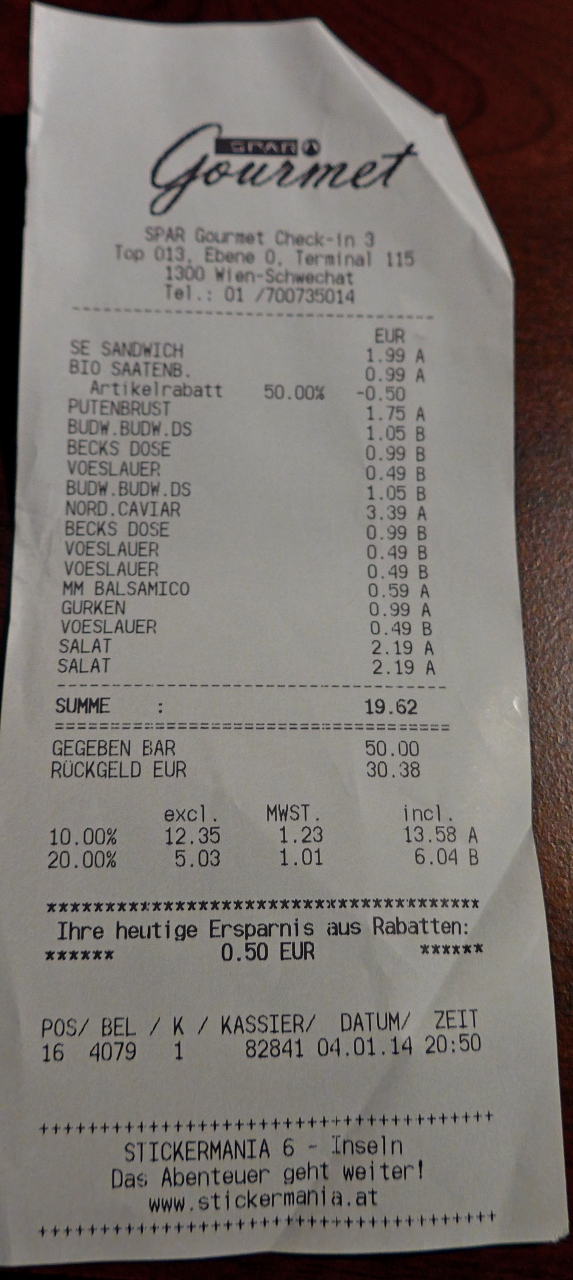 ウィーンの食事が高いし,おなかがそれほど減っていなくて,簡単なパンなどの食事で済ませたいとき,到着ロビーのSPARが便利.サラダ,パン,デリカテッセンにはホットミールまで売っている.5ユーロでもおなかいっぱい食べられる.セキュリティの中だったりすると高いのでここで買うのが安い!