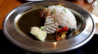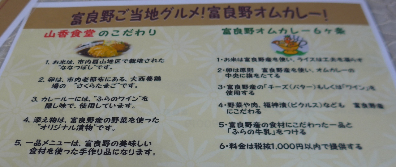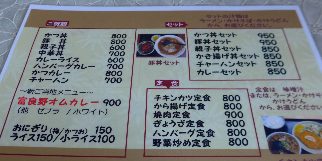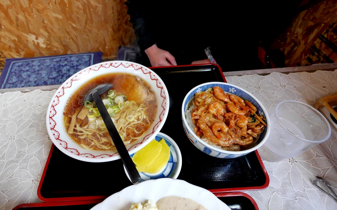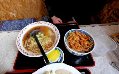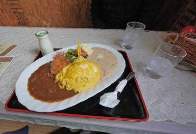 ご当地グルメの富良野カレー.900円と安いがボリュームあっておいしい.私はホワイトカレーと普通のカレー半分づつの「ゼブラ」を食べた.さらだや,牛乳,コロッケ付き!半熟の卵の下のオムライスが懐かしい.家人はかき揚げ丼とラーメンセット850円を食べる.混んでいるが絶対寄ったほうがいい店だ!大衆食堂的な感じもいい.