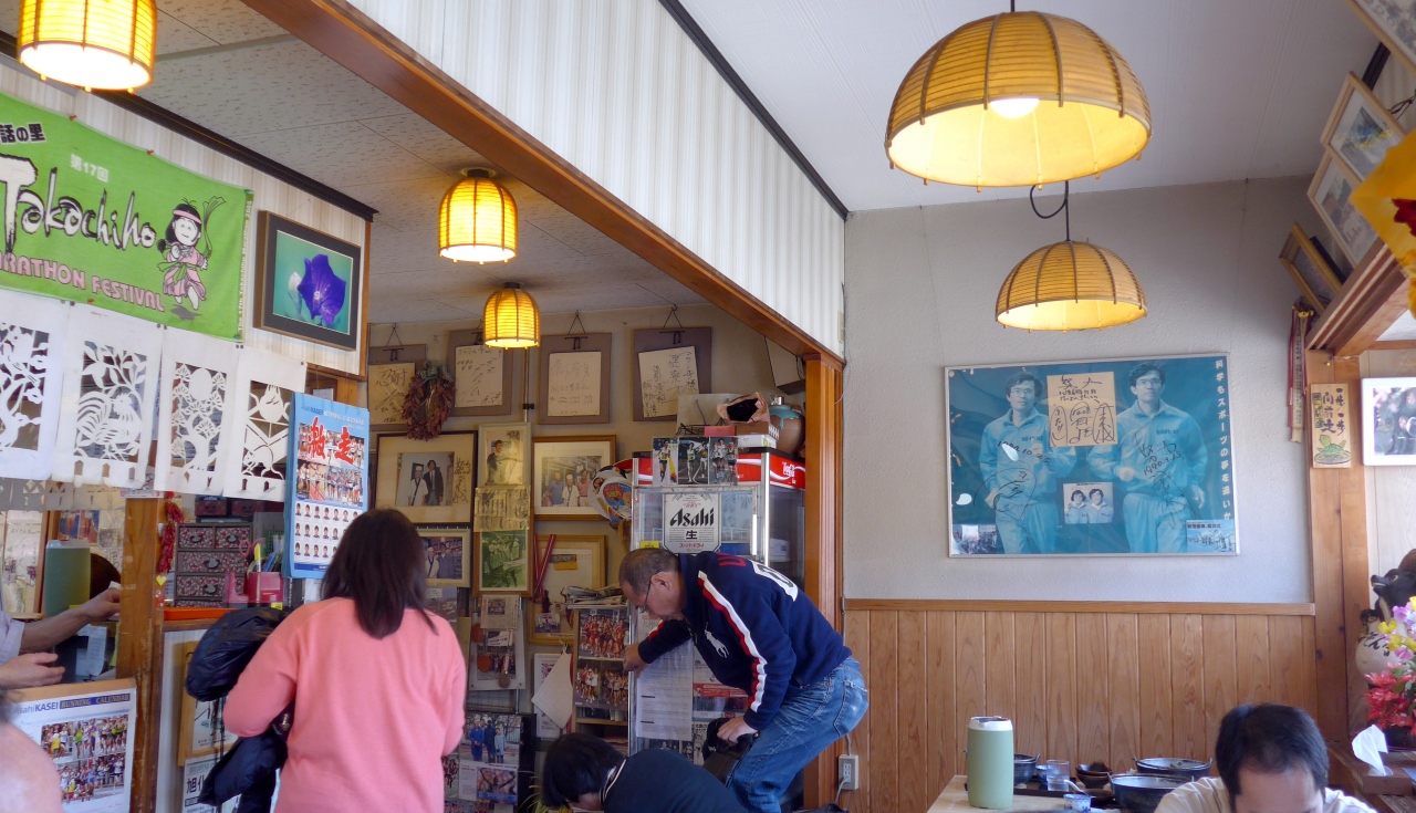 タクシーの運転手さんのすすめで「うどんの庄 まらそん亭」で昼食.宗兄弟や旭化成陸上部のポスターがところせましとはってある. そういえば延岡だったよね.店主が大のマラソン好きらしい.http://takachiho-kanko.info/gourmet/detail.php?log=1338278428&cate=&nav=2