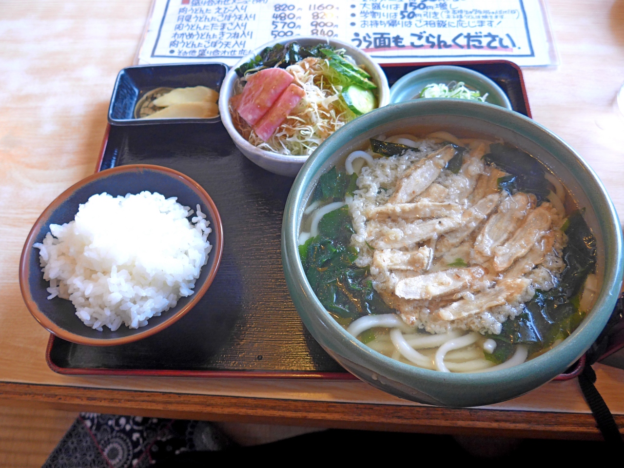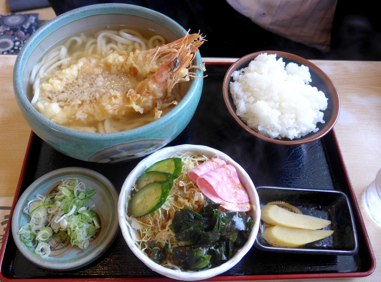 定食はうどんにサラダ,ごはんにお新香.量が多くて食べきれない.私はわかめうどんにごぼう天をトッピング.同伴者はえび天うどんを食べたが,うすあじでおいしかった.安いしおすすめの店.- 旅行時期