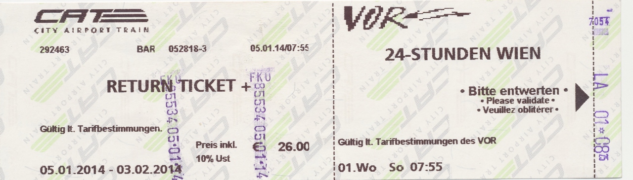 ウィーン市内の路面電車,Uバーン,Sバーンなどに乗るには24時間パスが便利 7ユーロ.1回券でも1時間以内は2ユーロで乗り換え可なので,4回乗らないと元が取れないが,いちいち切符を買わなくて便利.空港からは1か月有効のCATの券と合わせて26ユーロ