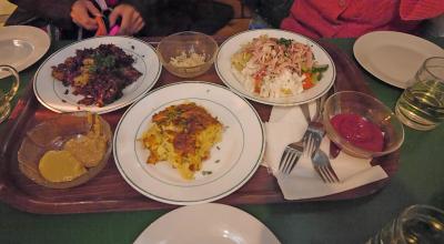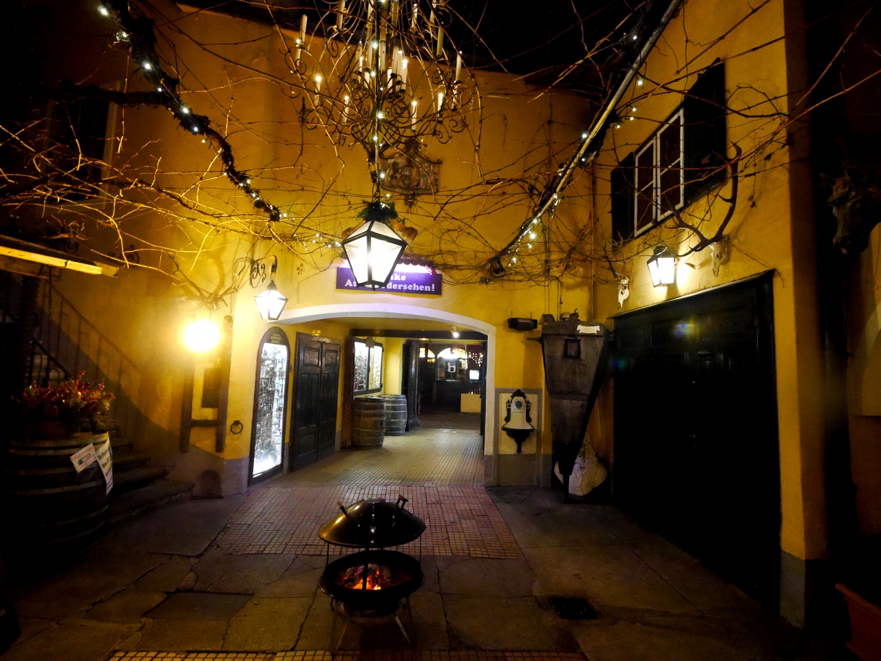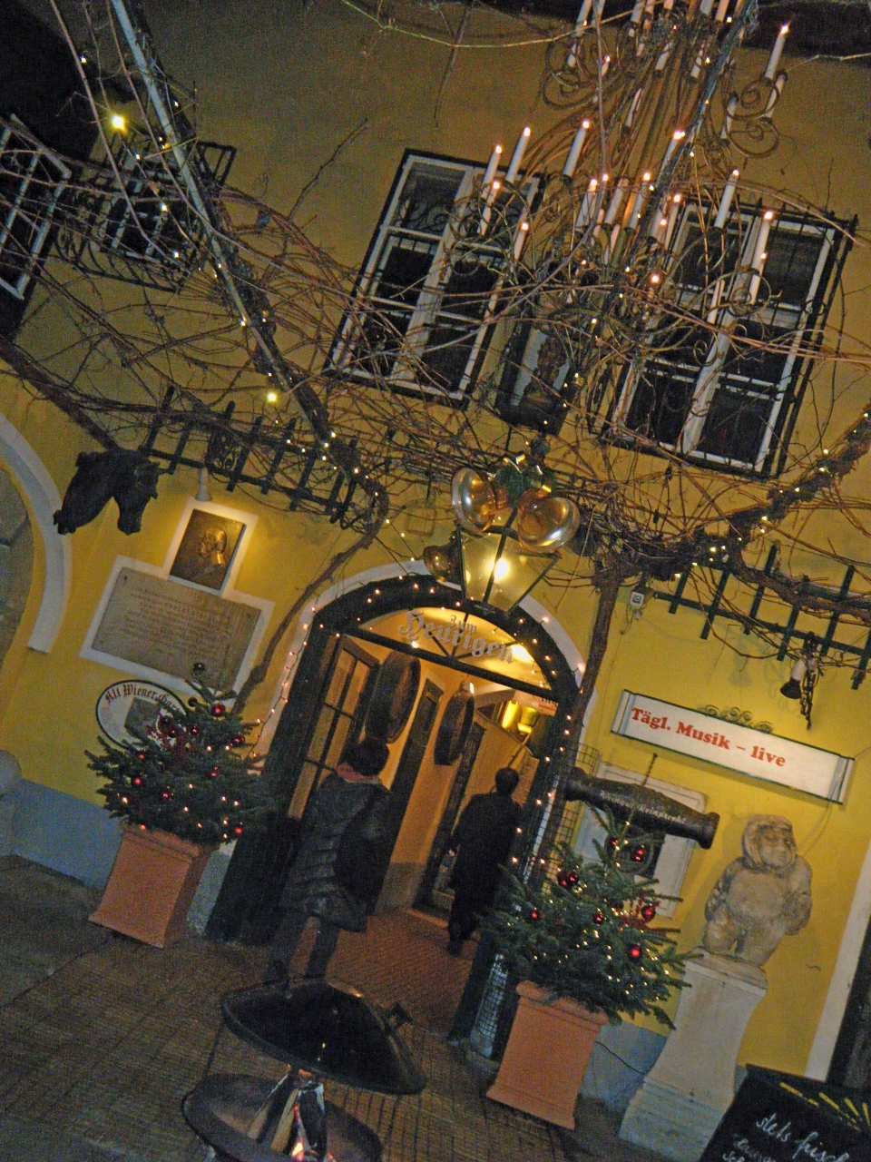 Grinzingでトラムの停留所から一番近いホイリゲ.修道院を改造した建物の雰囲気は良く,目の前の教会のライトアップもすばらしい.ヴァイオリンとアコーディオンの音楽も来る.料理は自分でカウンターに買いに行く.私たちは3人で31.2ユーロ.まあ一人1500-2000円あればおなかいっぱい食べられる.ワインは7杯で(赤ワインも4杯あって少し高めだが)23.6ユーロ.ビアホールより高めだが,十分安くて楽しめる.この気軽さがたまらない.Schottentorから38番のトラムで25分.終点歩いて3分.