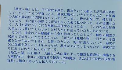 いかなくてもいいような福江島の城跡だが海の荒さや,そこの火山礫のような石が面白い.石類が残っているだけだが,車で行くとなると小さな道を海岸に沿っていく.サイクリングで行くのは難しくない.レンタカーで時間があるようなら寄ってもおもしろい.富江の先,案内板がある.