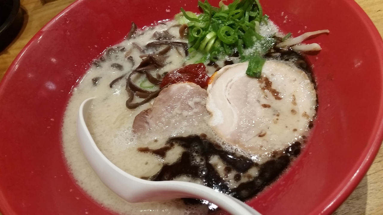 Tジョイ博多で昼・夜とライブビューイングをしたので、その合間にお昼ご飯として利用。食券方式ではなく、店員さんに注文し、食べ終わったらレジで会計をする方式。一人でも気軽に利用できる席の作りでラーメン屋としてはゆっくりできた。この日は人気ナンバー1と書かれていた赤丸新味(820円)を注文。食べやすい味で、良い意味では飽きる事なく食べる事ができ、悪い意味では特に癖がない、といったところ。からみ麺というのも気になったのでまた機会があれば食べてみたい。