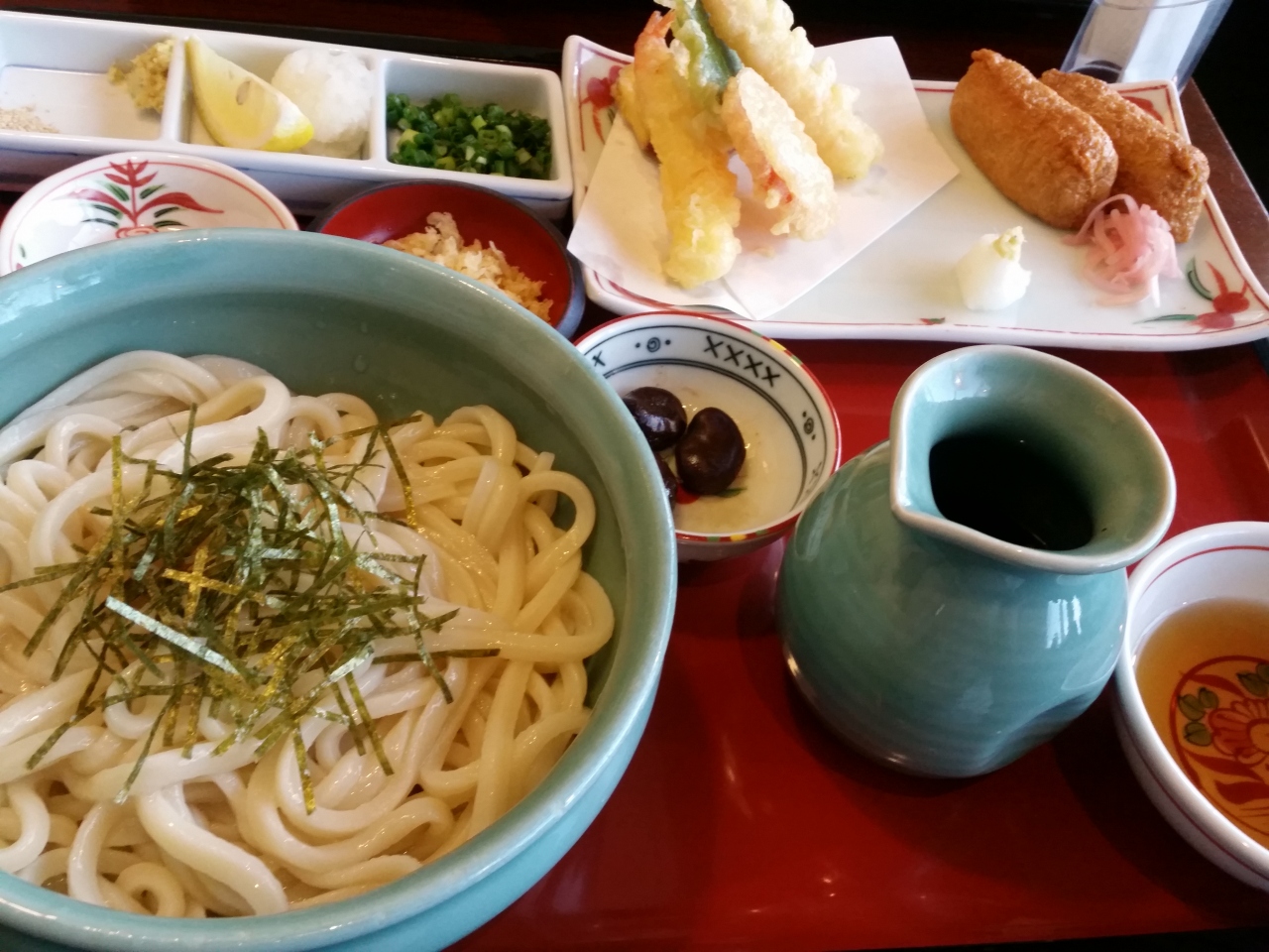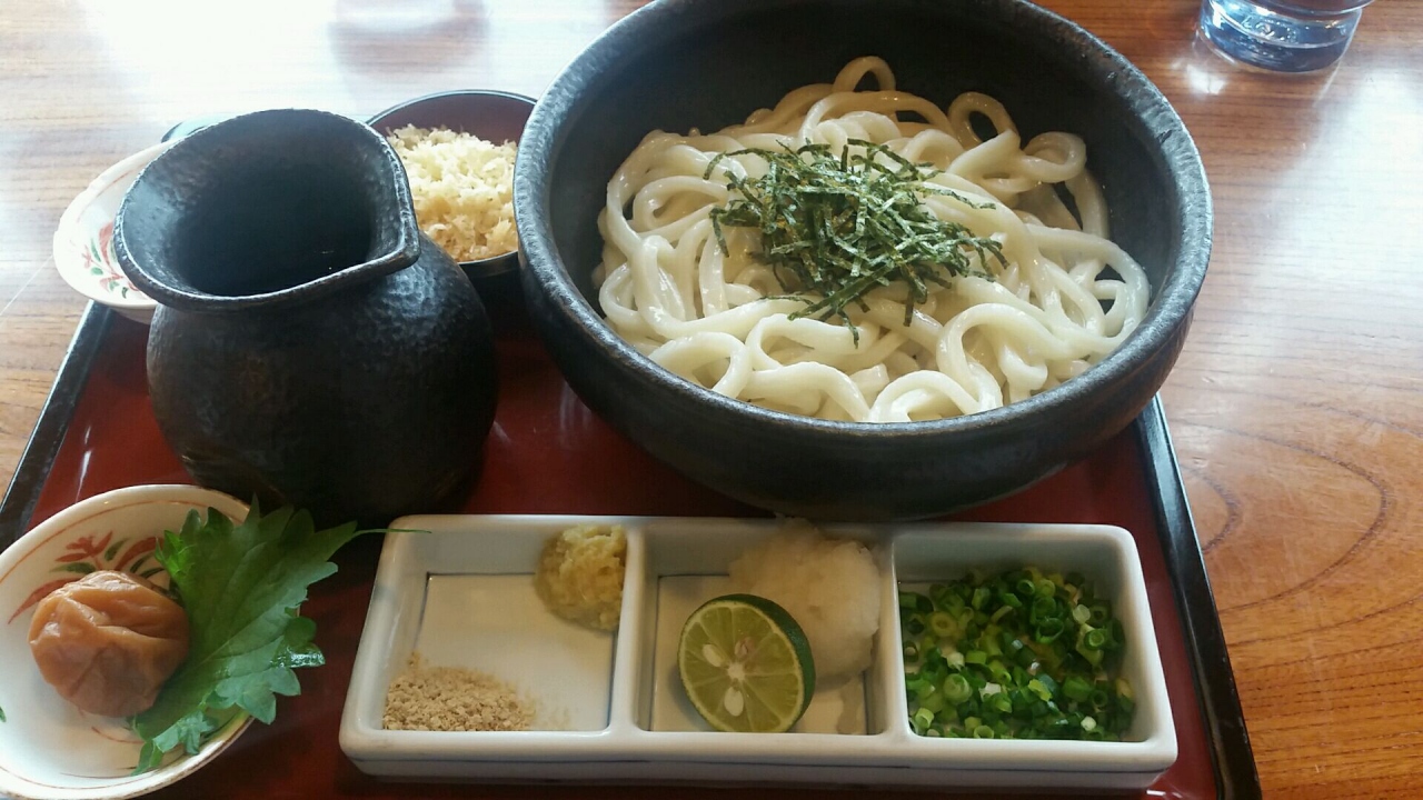 スカイツリーソラマチにあるうどん屋さん。浅草で食べ歩きをしたかったので、昼食は軽めにしたいということで来店。金曜という平日であったが、10組ほどの待ちが出来ていた。しかし麺類で早く食べることができるという事もあり、さほど待つ必要はなかった。案内されたのは外の眺めが一望できる横並びの席。あいにくの天気ではあったがゆったりとした時間を過ごすことができた。店員さんは少し不慣れな方が多いのか接客がたどたどしかった。(愛想がないわけではないので嫌な感じはしなかった。)この日いただいたのは、商標登録をされている釜ぶっかけ860円に、卵黄+60円と梅干し+150円をトッピングしたもの。麺はモチモチですごく美味しかった。他にも定食や天ぷらうどん等のメニューがあった。