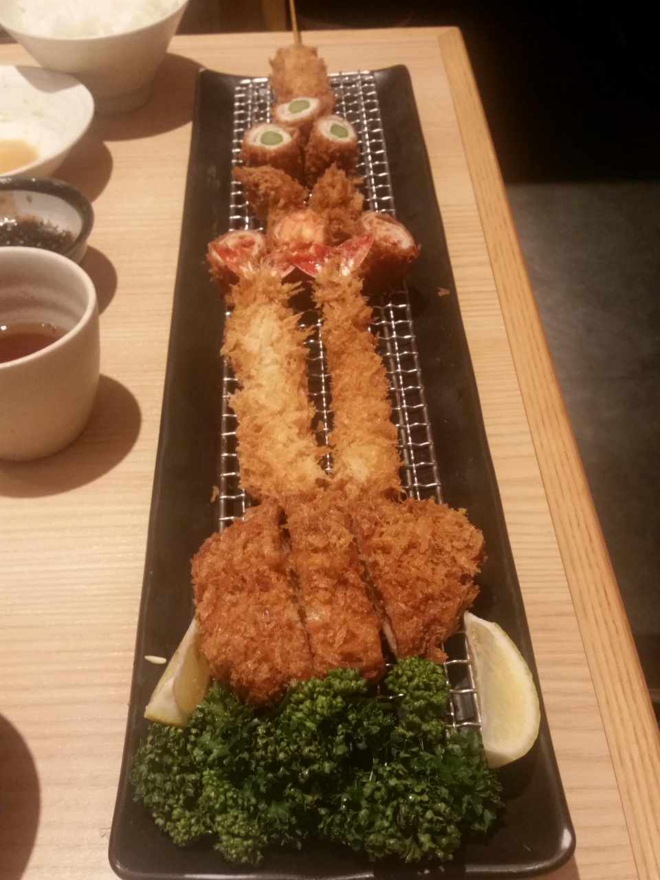 お盆の時期ということもあって、この日のソラマチは多くの人で賑わっており、飲食店街にも多くの観光客や家族連れが…。お昼の12時過ぎ頃だった事もあり、このお店も20名ほど店前にお客さんが並んでいた。でも、人の多さにはかなり慣れているようで、店先にいるスタッフがお客さんを案内していないあいだは、並んでいる人にメニューの説明をしたり、早めにオーダーを取ったりと二度待たずに済むようなシステムになっていてとても好印象だった。この日は、この店舗限定のとんかつをスカイツリーに見立てた「スカイツリー虹」というメニューを注文した。+500円弱でご飯・お味噌汁をつけることもできる。二人で分け合ってちょうど良い量だった。お肉以外にも玉ねぎの串カツやアスパラ巻き、明太チーズ巻きなどを食べる事が出来る。ご飯・お味噌汁・キャベツはお替り自由。