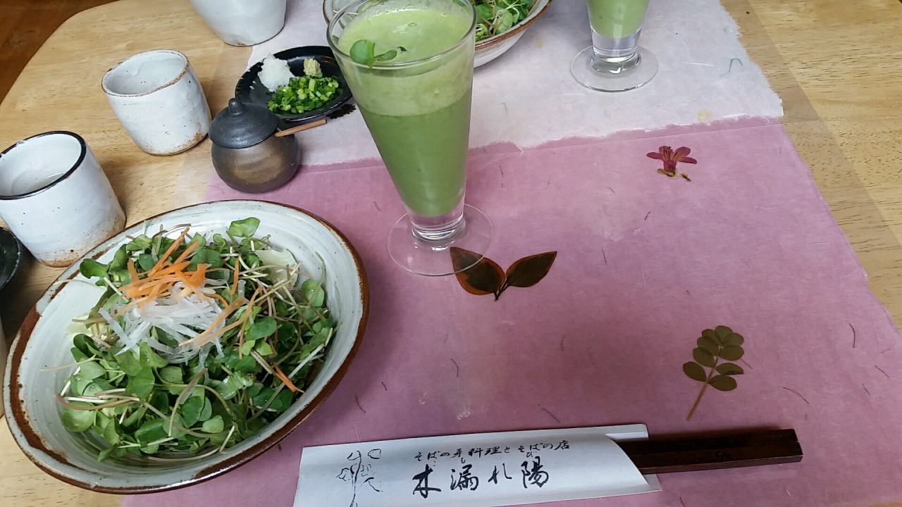 福岡ウォーカーに掲載されていて気になっていた蕎麦屋さんに来店。希少な在来種である「北山蕎麦」を栽培・自家製分し、その粉やそばの芽で御膳を提供するお店。場所は国道263号から離れた静かな場所に建っている。近くまで来ると看板も立っているのでわりと場所はわかりやすい。土曜の13時頃に訪れたが、お店の外に10名ほど待ちのお客さんが並んでいた。この日は、そばの芽ジュースとサラダ、盛り蕎麦がセットになった「若葉」というコースを注文した。そばの芽ジュースは飲みやすい甘めの青汁のような味がした。蕎麦は、最初は塩であとはご自由にお召し上がりくださいとの説明を受けてから食べた。わりと年配の夫婦が客層としては多かったが、若い人でも十分に楽しめるお店だと思う。