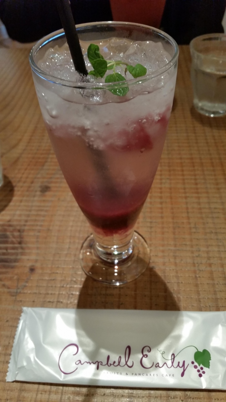 ランチ後、喉が渇いたタイミングで来店。土曜の13時頃来店したが、お客さんがお店の前にずらりと並んでいた。15〜20分程度待ってからいよいよ入店。店員さんは女性が多く、おしゃれな雰囲気の方が多かった。客層としては、女性が多いが、わりと40−50代くらいの男性も多く来店していた。パンケーキやパフェ等のメニューもあるが、お腹は空いていなかったので今回は、ドリンクを注文。店名にもなっているキャンベル・アーリー(黒ぶどう)のソーダを選択。お値段は730円で飲み物としてはやや高いが、飲んでみて納得。フルーツがふんだんに使われており、味もすごく美味しかった。また違うメニューも頼んでみたくなった。