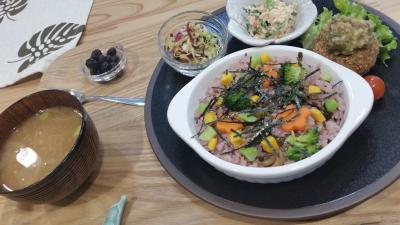 雑誌で見かけた武蔵寺に行ったあとに、近場におしゃれなランチを食べることができるお店はないかな~とネットで探していたところ、発見したのがこのお店。朝倉街道からすぐで、駐車がしにくいのは難点だがすぐにお店を発見できた。中に入ると、木のぬくもりが感じられる建物で、味噌や醤油など様々な調味料が販売されていたり、ベビー用品や洗剤などの雑貨が販売されていたりと、カフェ以外にも色々と楽しむことができた。ランチは1つのみで、1000円のワンプレートランチ。+αでドリンクをつけることもできる。この日のメインはちらし寿司だった。素材の味が楽しめて自然と一口ひとくち噛みしめながら食べていた。店員さんの印象も柔らかく、また行きたいと感じた。