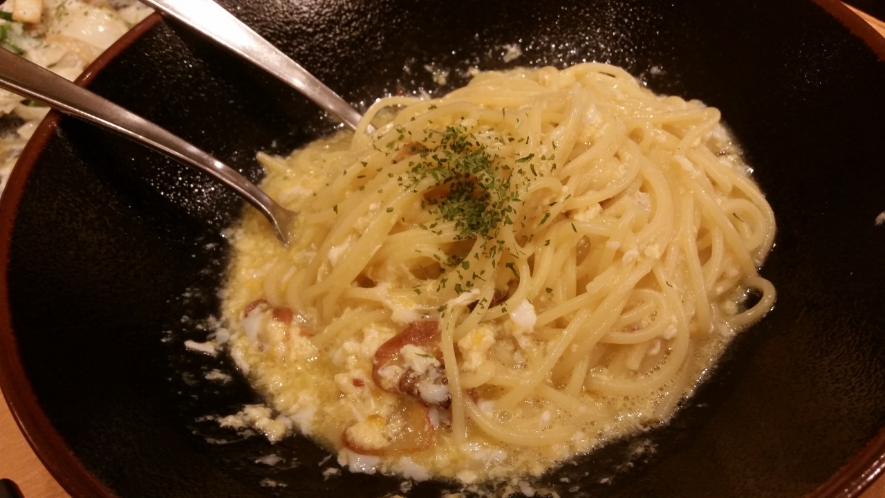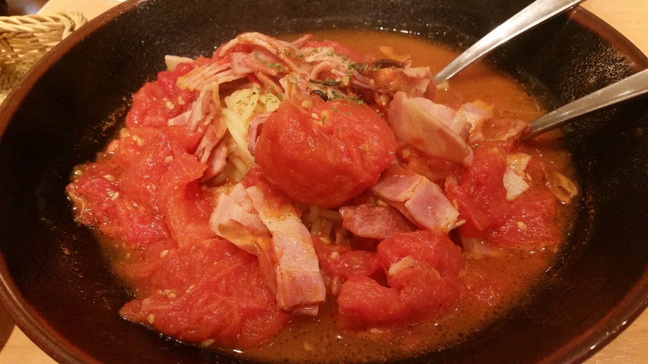 今回はお店人気1,2位のパスタを注文。1位は、「ぺぺ玉」という玉子が麺に絡んだパスタ。別皿のタバスコをかけるとかなりスパイシーな味わいに変わるので、二度ちがった味を楽しめる。2位は、完熟トマトとベーコンのパスタ。ニンニクがかなり効いていた。トマトは大きめのものを2−3個使用しているとのこと。パスタの他に、ピザ・ドリア・フレンチトーストなどもある。一度訪れると別のメニューを食べにまた行きたくなるお店だ。