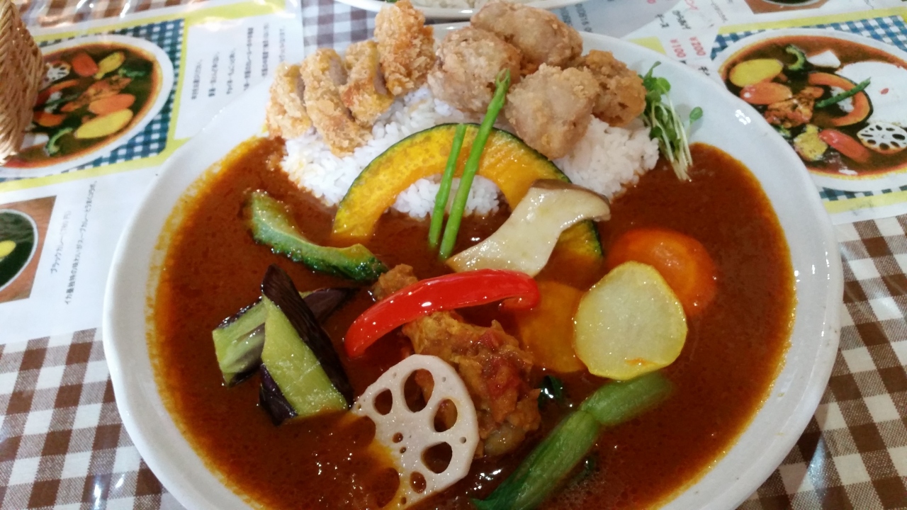 「福岡のおいしいカレー屋さん」という雑誌に載っていたので初めて来店。+100円で9種もの野菜のトッピングが味わえるのが売りとのことで、迷わずにチキンカレーに野菜トッピング。それに加えて、トッピングのヒレカツ・唐揚げをシェア。運ばれてきてまず驚くのがお皿の大きさ。想像するカレーよりもだいぶ大きかった。カレーの辛さは5段階で選べる。まず、視覚でお腹がいっぱいになるのではないかと思うくらいの野菜たち。9種の野菜が1つずつトッピングされているのかと思いきや、ナスやジャガイモなどは2つずつ乗っかっていてかなりのボリューム。食べる前には、お手製の前掛けも用意してくれてお店の温かみを感じた。多くの人に愛される理由が分かるカレー屋さんである。