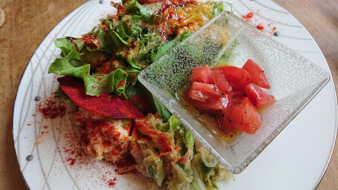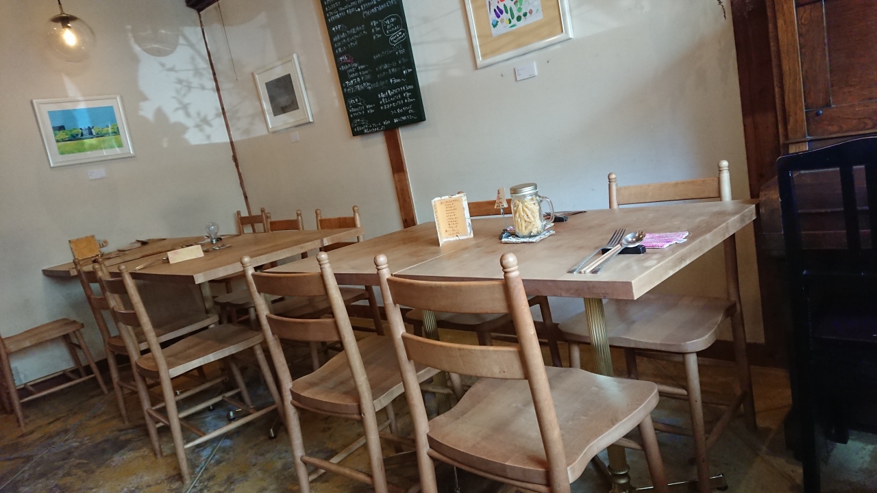 フリーペーパーの懸賞でこちらのオリジナルジャムセットが当選したのがご縁で、こちらのお店でランチをいただく事に。西鉄久留米駅からほど近い場所に存在する古民家カフェ。駐車場は車が3台停められる程度でかなり狭い。お店の入り口がオシャレで店内に入る前に期待が膨らむ。お店に入ると厨房・カウンターが目の前にあり、左側に行くとテーブル席がいくつかある。今回は予約していた事もあり、一番奥の窓側の席で食事をする事が出来た。両親との来店だったのだが、母・父はパスタ、自分はオムライスを注文。最初に運ばれてくるサラダがなかなかのボリューム。盛り付けがオシャレだった。オムライスは、デミグラスソースがたっぷりとかけられていてその上にレンコン、ゴボウ、にんじんといった野菜がゴロゴロとのっていた。店内を見ていると「地産地消」の文字が。なるほどそれがウリだからこんなにも野菜沢山なんだと思った。食後は+300円でデザートを注文。こちらもボリュームが予想よりもあり、美味しかった。ぜひ他のメニューも食べてみたいと思った。