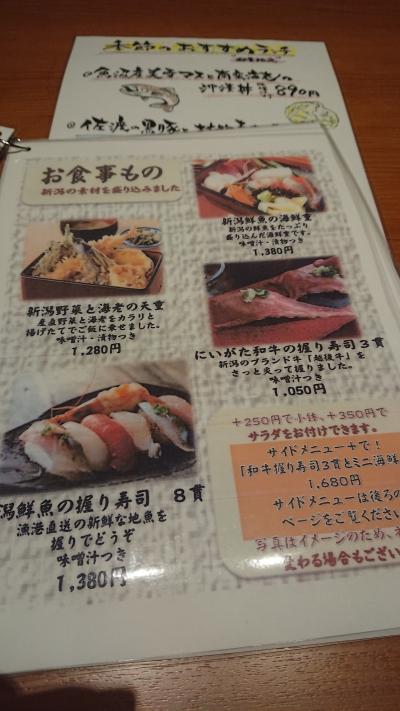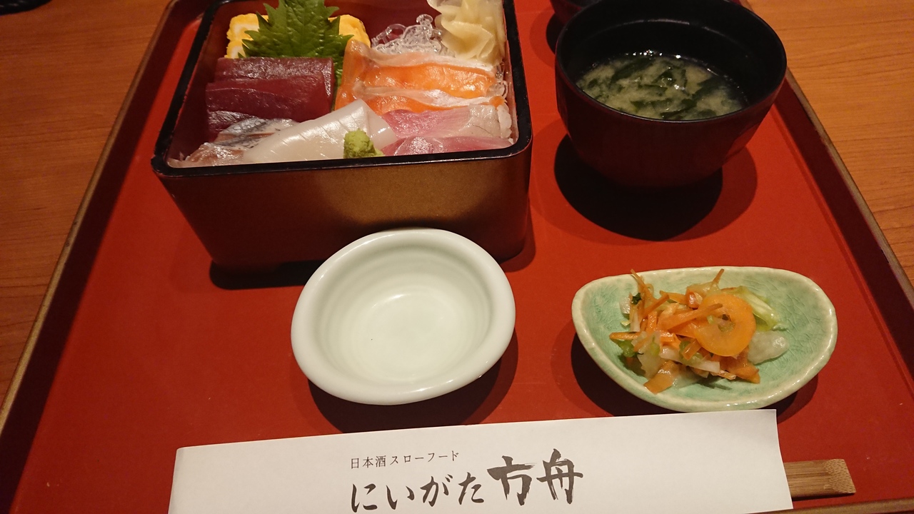 新潟の新鮮なお魚を食べたいと思い、まずは新潟駅すぐのCocolo南館にあるこちらのお店へ。開店の11時になってすぐ入ったこともあり、一人での利用にも関わらず4名席に案内してくれた。(知らない土地に初めて来たので少しゆっくりしたいと思っていたのでありがたかった。)席は半個室のようになっており、人目を気にせずに食事が出来たのもありがたかった。今回は海鮮重(1,380円)とランチドリンク(食後カフェラテ100円)を注文。お弁当箱のような立派な四角い器にぎっしりとお刺身が並べられていて見た目から楽しい気分に。ご飯の量はそこまで多くないので、お財布に余裕があるならもう一品注文したら良い感じ。お味噌汁はおかわり自由とのことだった。ゆっくりできたので感謝。