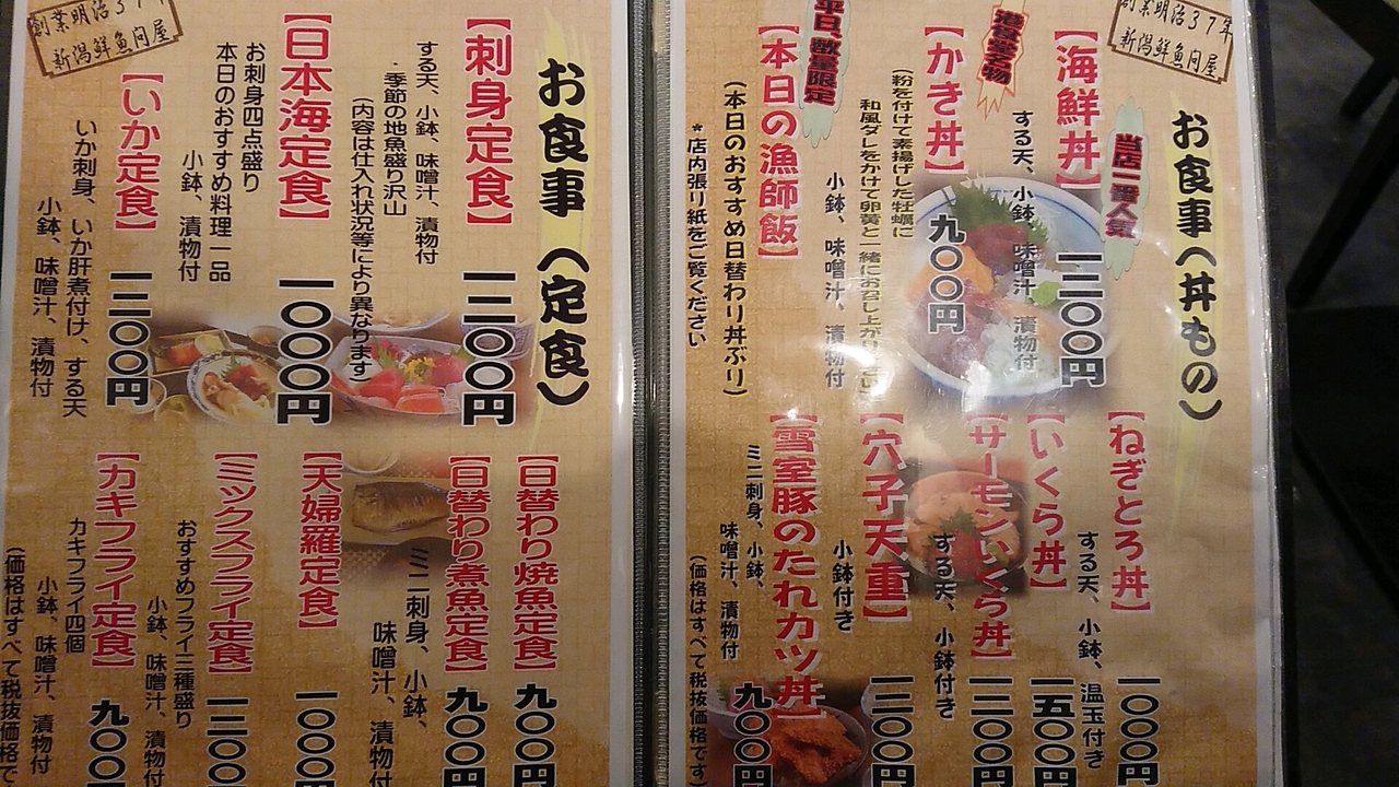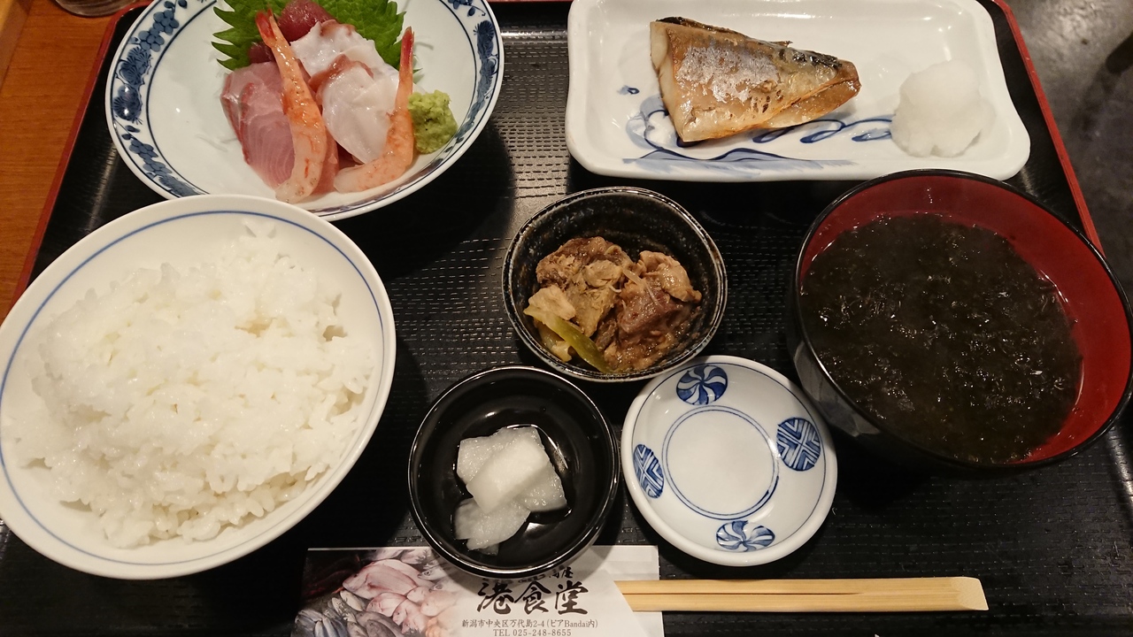 ピアBandaiにあるこちらの食堂は、新潟鮮魚問屋ということで新鮮な魚料理がウリのお店。今回は、ごはん、お味噌汁、漬物、小鉢、本日の一品、刺身4種盛がセットになった日本海定食(1,000円)を注文。席は、テーブル席と小上がりとがあった。わりとすぐに料理が出てきて、最初に目がいくのがやはりお刺身。見るからに新鮮でプリプリしていそうで期待も高まる。一口食べてみると「美味しい!美味しい!」とお口が喜ぶレベル。特に海老とタコが美味しかった。本日の一品はこの日はサバの塩焼きだったのだがこちらも美味。この美味しさでこの値段が実現できるのは問屋だからこそ。コスパが抜群。近くにあるなら常連になりたいレベル。店員さんも市場の食堂だとサバサバしすぎて冷たい感じを受けるお店も多いが、こちらの店員さんはわりと優しい印象の方が多くて素敵だった。