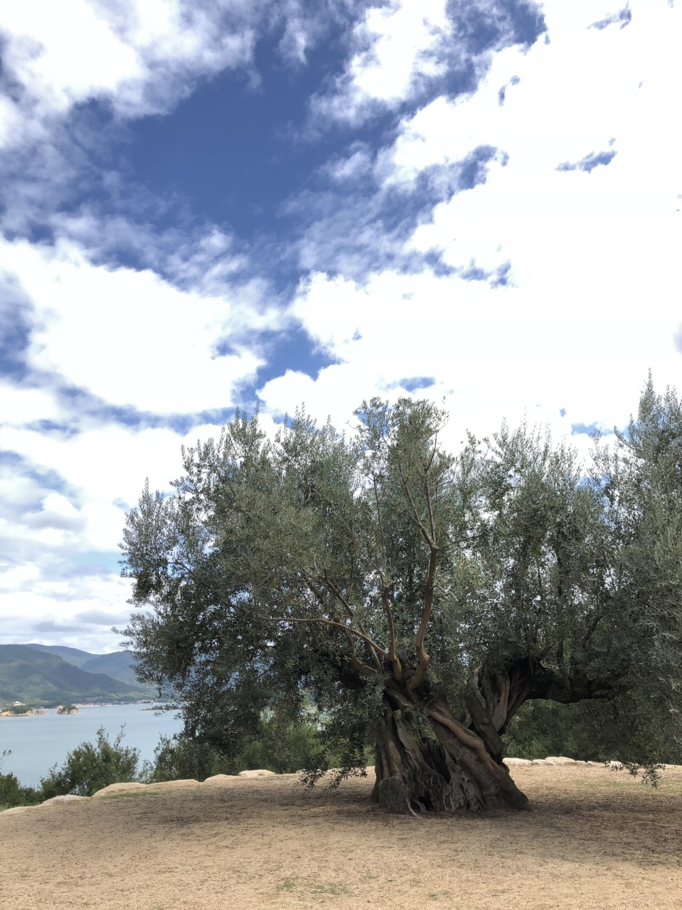 小豆島の土庄近くにあります。道から少し入ったところに、ひっそりとありました。スペインから移植されたそうですが、他の木よりも古さを感じるものの、そこまで大きさに差はなく、写真だけ見るとよく分からないかな。それでも、この辺りから海も見えるし、記念撮影はちゃんとできます。