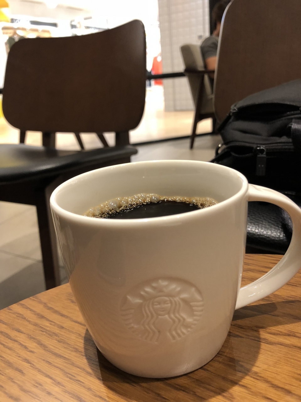 あのスターバックスの支店です。京阪電車の京橋駅隣接の京阪モールの2階にあります。かなり昔からあるので、歴史は長いのかな。平日の昼休みの時間帯に寄りましたが、店は広くて空席もありました。屋根裏が線路のようで、電車が通ると響いてきます。