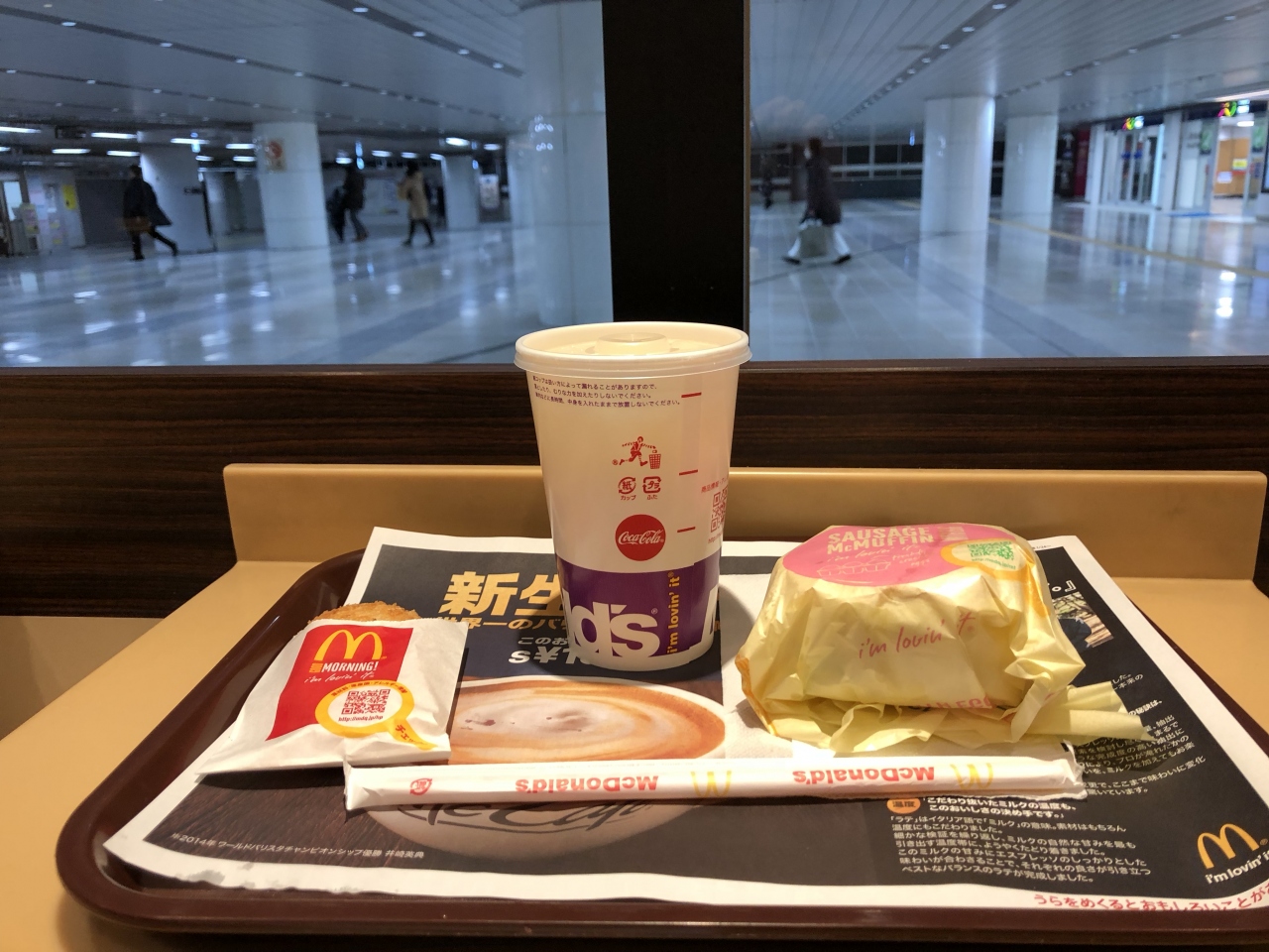 朝の7時代の新幹線に乗るため、家で朝食を取らずに、新大阪駅で取ることにしました。久々にマクドナルドがいいと思い、探したところ、御堂筋線の改札を出てすぐのところにありました。新幹線改札からは少し距離がありますが、その分、空いていて、空席も多くありました。