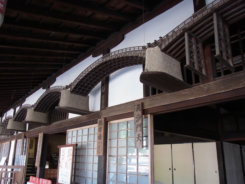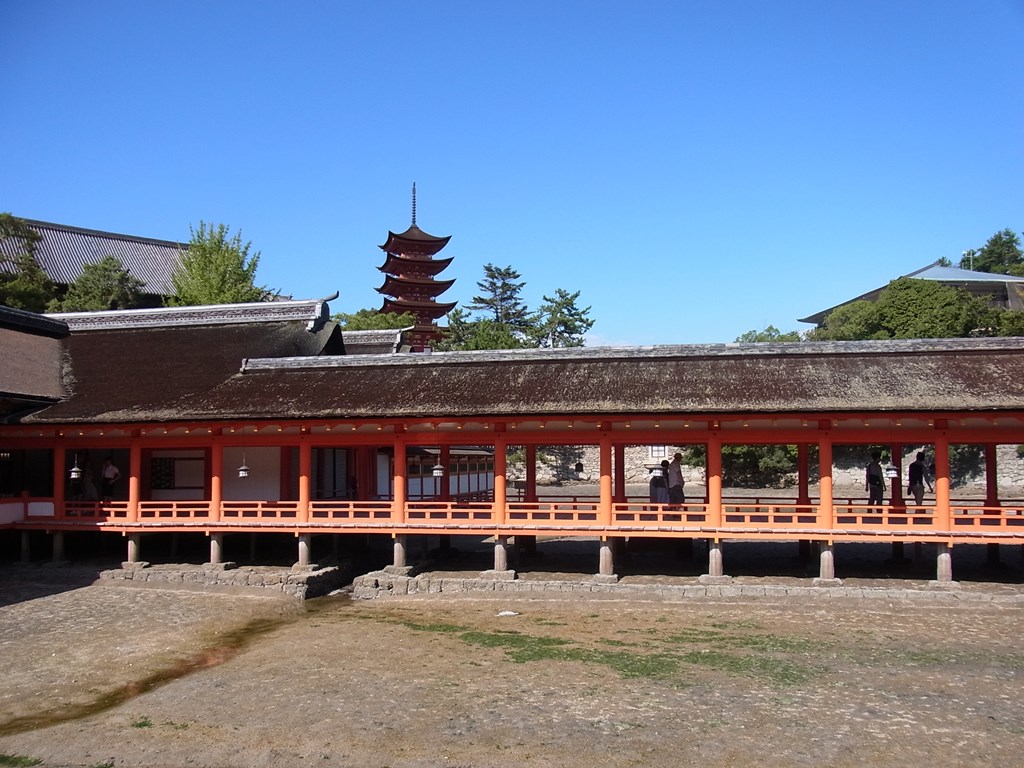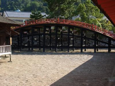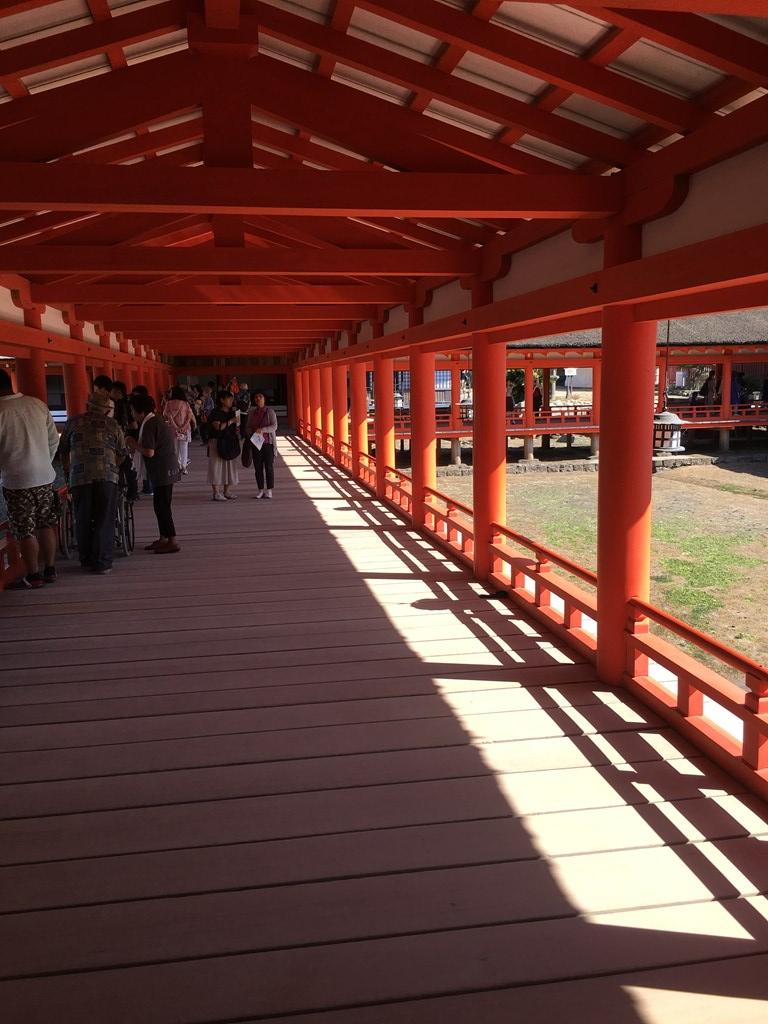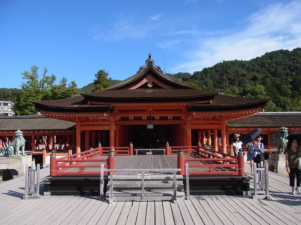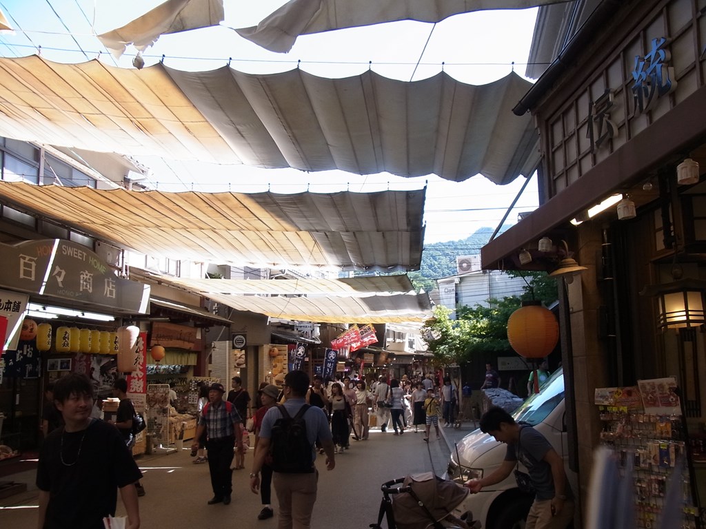 宮島の名所、厳島神社の参道です。宮島の港から神社まで結んでおり、沿道には多くのお土産屋さんやカフェ、レストラン、宿泊施設があります。アーケード代わりに建物に布を渡して屋根にしてくれているなど、親切なところでもあります。