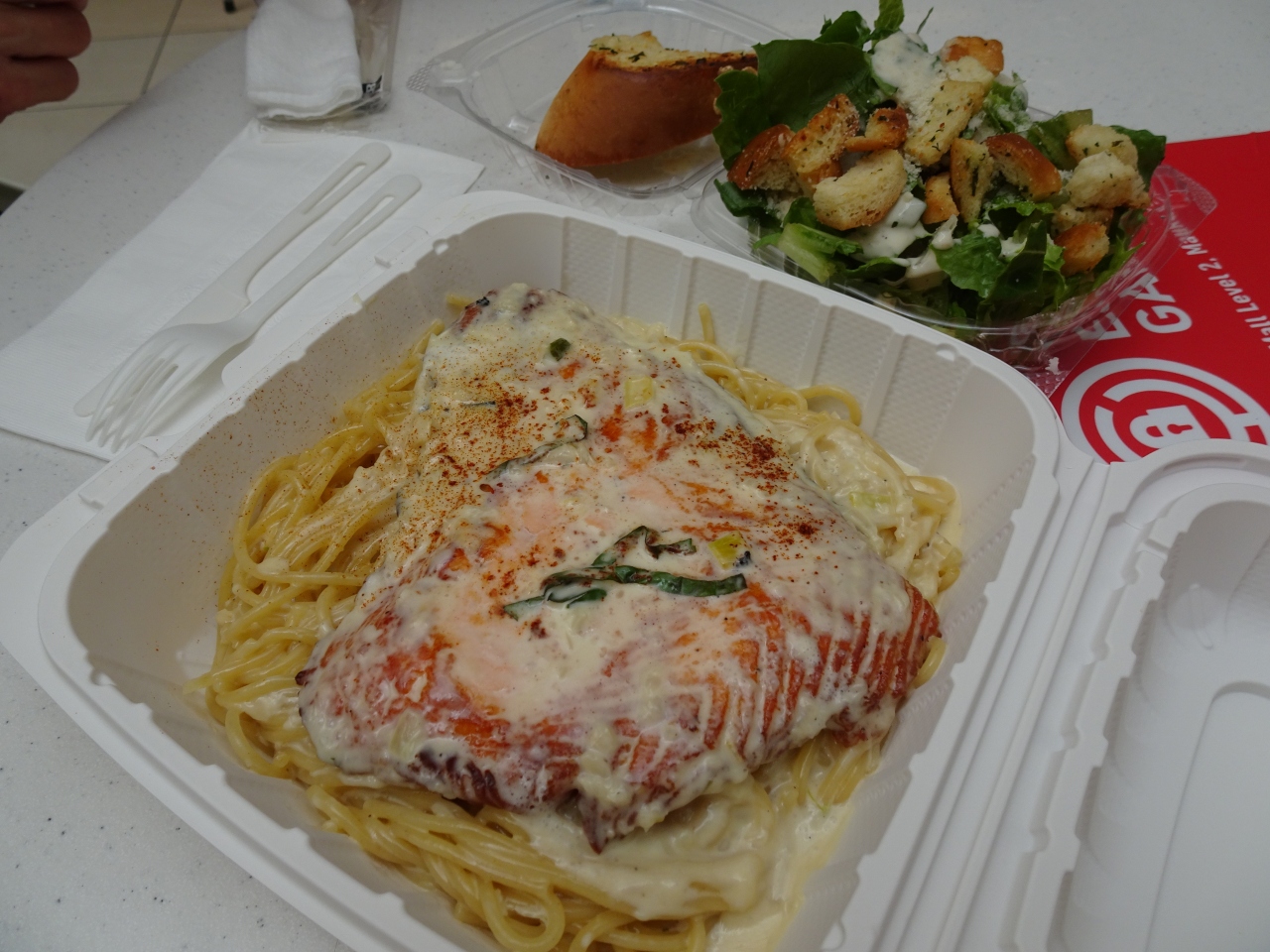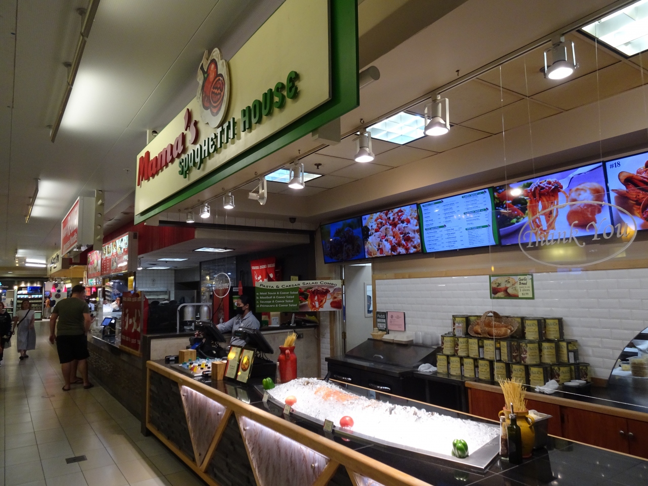 アラモアナセンターにある、スパゲティのお店です。サーモンのパスタですが、パスタの上に焼いたサーモンが乗っているだけで、日本のように細かく刻んでおらず、さすがアメリカという感じです。ただ、量は多いので、2人で食べたらちょうどいいかな。手軽に安く食べれるところです。