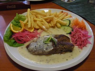 クリームソースの中にステーキが浮かんでいるという、日本では経験できない食べ方ができます。また、まわりにある野菜も漬物のような感じで、とても美味しかったですね。