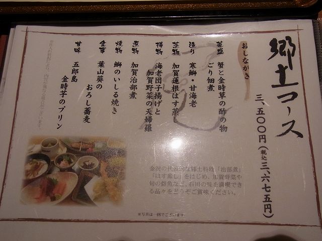 ただ、当日でも注文可能な「郷土料理コース」では、金沢名物の治部煮や、能登で作られる魚醤である「いしる」を使った焼魚など、地元料理を存分に食べることができます。