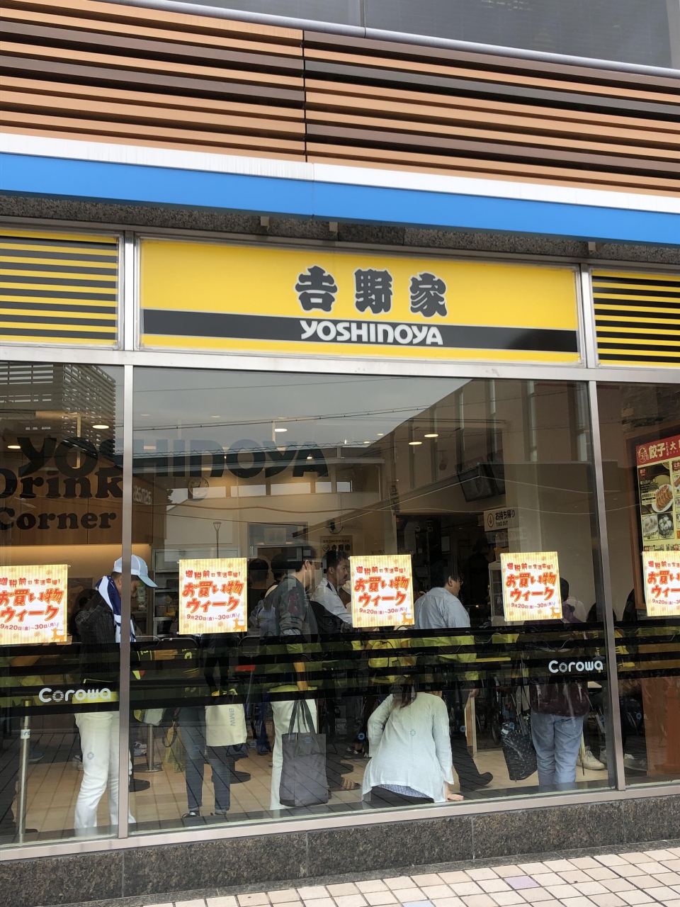 あの牛丼チェーンの吉野家のお店です。甲子園にあるので、店頭はオレンジ色ではなく黄色になっています。そりゃ、そうですよね(笑)