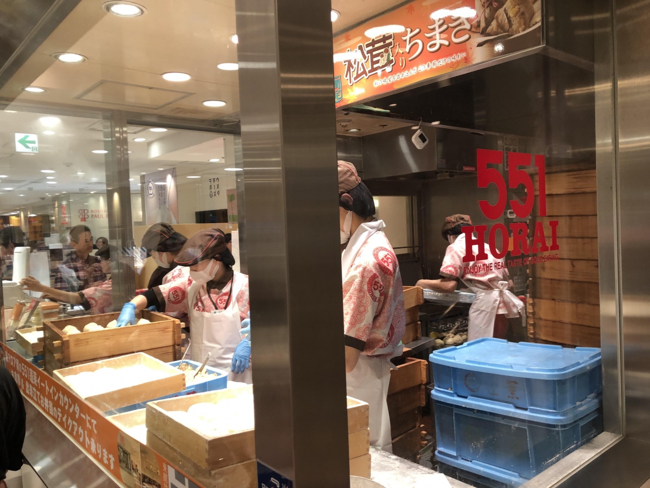 大丸の地下食品売り場には、551の蓬莱の店が入っています。梅田エリアでは、阪神百貨店、阪急百貨店にも入っています。甲子園球場で野球を見ながら食べるのが好きで、よく梅田で買っていきます。阪神梅田駅に近い、この大丸梅田店がおすすめです。