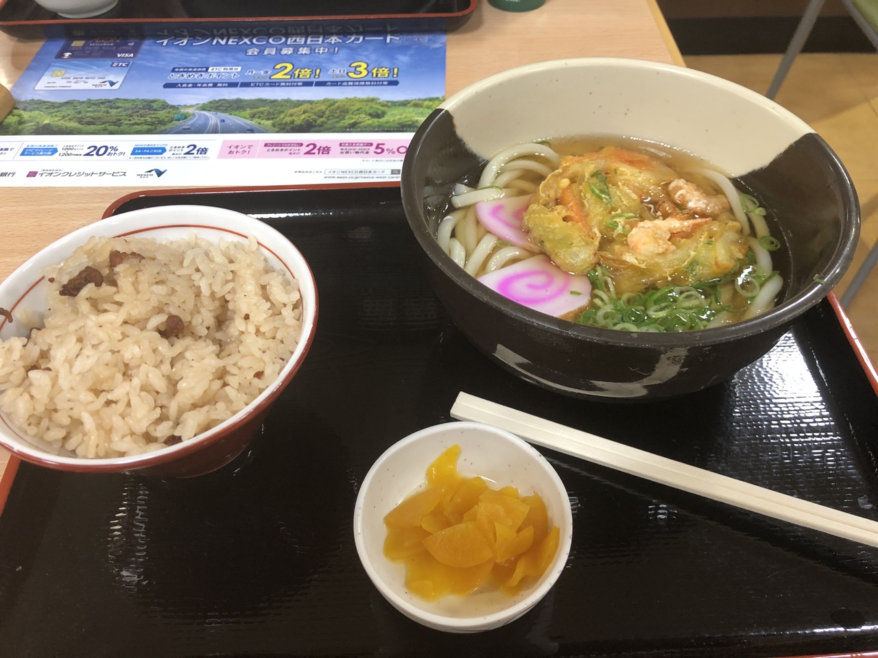 中国自動車道にあるサービスエリアにあるフードコートです。サービスエリアにはレストランとフードコートがあり、フードコートの方を使いました。席は回転が早く、意外と簡単に確保。メニューはうどんやカレーといった定番のものから、なぜか名物になっていたタコ飯まで様々です。