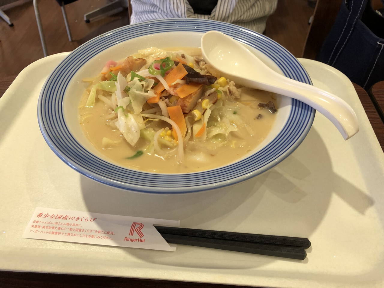 リンガーハットは長崎チャンポンのチェーンです。街中の店で食べると1000円近くしますがが、ここでは約600円弱で、しかも麺増量が無料、とてもお得です。この日は特に増量しませんでしたが、コスパは良くて、また使いそうです。野菜が多いのがいいですね。