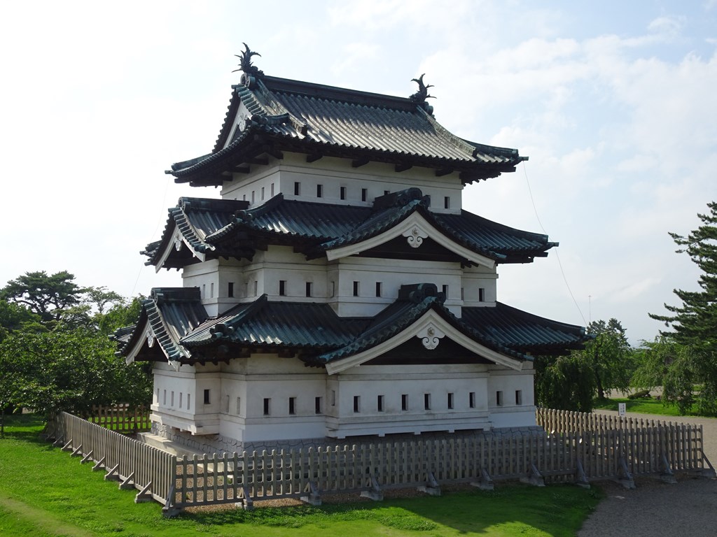 桜で有名な弘前城ですが、2018年時点では石垣を改修工事中で、これに伴って天守も移動しています。元々、天守といっても、形式上は櫓であり、天守台らしきものは無いので、容易に移動できたのでしょう。天守は本丸跡の広場に「置かれています」。中には入れますよ。