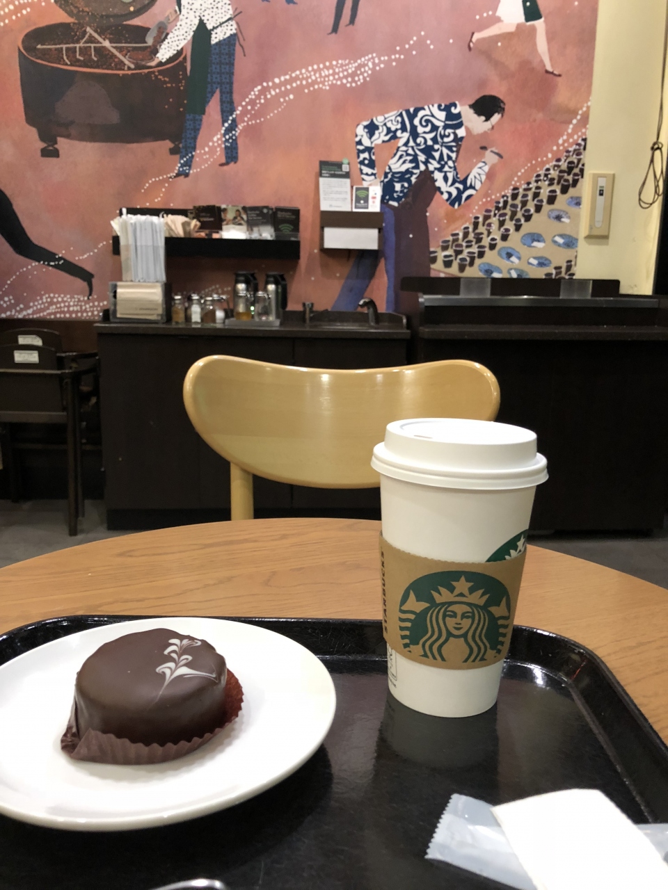 恵那峡SAで夕食を取ったあと、ここでコーヒーブレイクにしました。混雑しているのが行列だけで、店内にはほとんど座っている人はいません。おそらく、遅い時間だったので、テイクアウトの人が多かったからでしょう。味や店の雰囲気はすべて普通のスタバと一緒でいっさいに手抜きはありません。ご安心を。