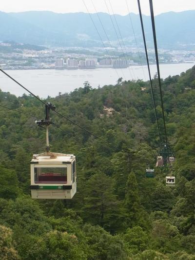 宮島から弥山へ登るロープウェイです。途中で乗り換える必要があります。下の方はゴンドラ、上の方がロープウェイです。この上の方にあるロープウェイからは、島の厳島神社の反対側の瀬戸内海がとても良く見えます。乗っている時間は全体で10分程度ですが、厳島神社とは別の宮島の姿を見れた気がしました。