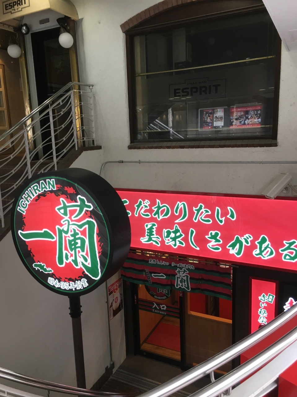 博多ラーメンの名店です。2016年の秋か冬に大阪梅田、阪急の駅の近くにできました。一蘭は、仕切られたカウンターで食べるのが特徴の博多ラーメン屋で、ここも同じ形式です。ただ、博多で食べた一蘭と比べると、少し味が落ちた気がします。また、チャーシューも薄いです。