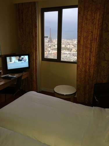 パリには珍しく高層ビルなので、とてもよく見えます。グレードが低い部屋でも、エッフェル塔が真正面に見えて、感動しておりました。- 旅行時期